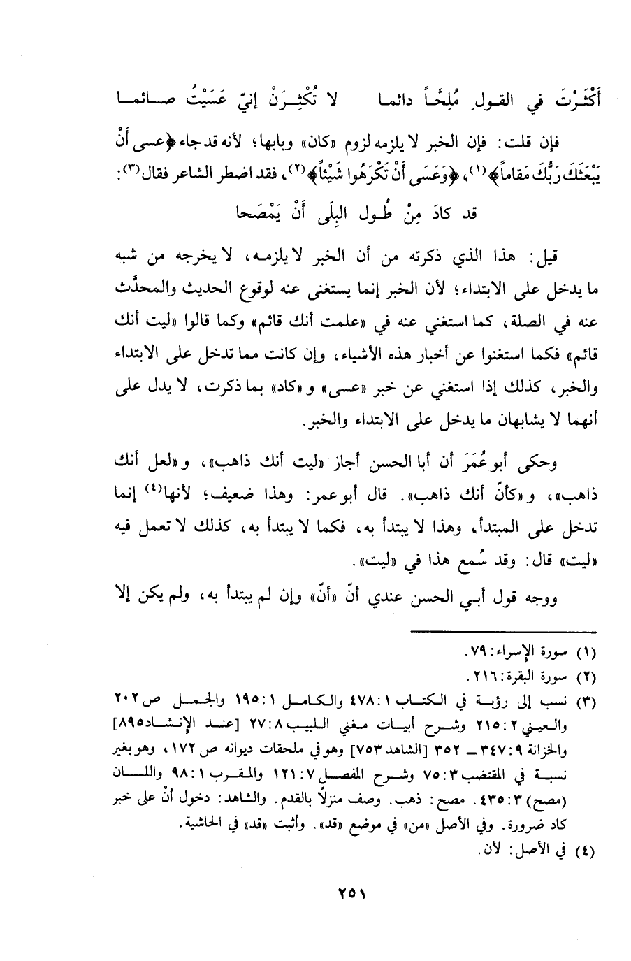فإن قلت: فإن الخبر لا يلزمه لزوم "كان" وبابها؛ لأنه قد جاء {عسى أن يبعثك ربك مقاماً}، {وعسى أن تكرهوا شيئاً}، فقد اضطر الشاعر فقال: