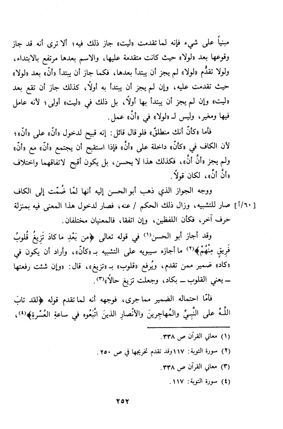 وقد أجاز أبو الحسن في قوله تعالى {من بعد ما كاد تزيغ قلوب فريق منهم} ما أجازه سيبويه على التشبيه بـ "كأن"، وأراد أن يكون في "كاد" ضمير ممن تقدم، ويُرفع "قلوب" بـ "تزيغ"، قال: "وإن شئت رفعتها -يعني القلوب- بكاد، وجعلت تزيغ حالاً".