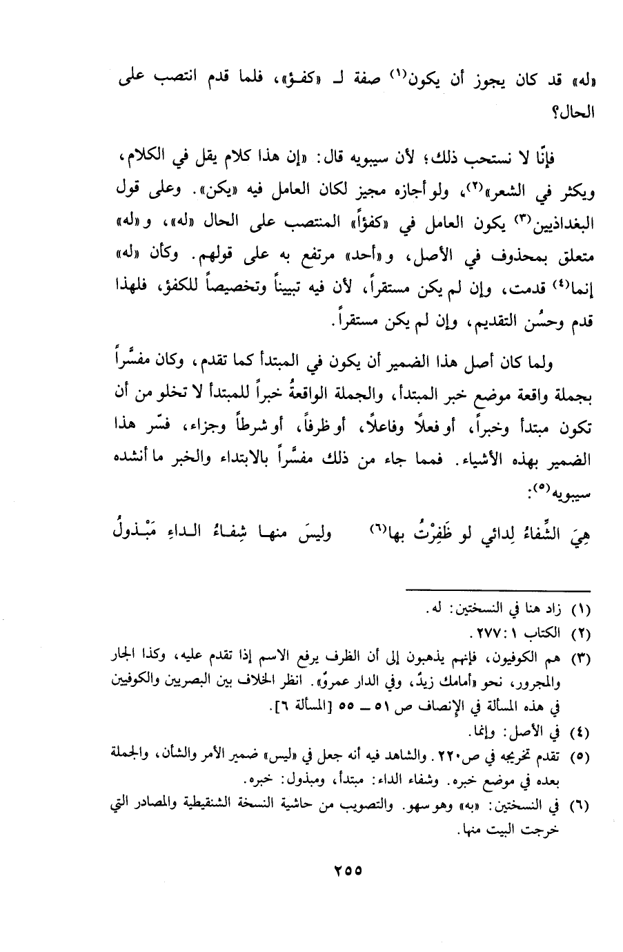 فإنا لا نسحب ذلك؛ لأن سيبويه قال: "إن هذا كلام يقل في الكلام، ويكثير في الشعر"، ولو أجازه مجيز لكان العامل فيه "يكن". وعلى قول البغداذيين يكون العامل في "كفؤاً" المنتصب على الحال "له"، و "له" متعلق بمحذوف في الأصل، و "أحد" مرتفع به على قولهم. وكأن "له" إنما قدمت، وإن لم يكن مستقراً، لأن فيه تبييناً وتخصيصاً للكفؤ، فلهذا قدم وحسُن التقديم، وإن لم يكن مستقراً.