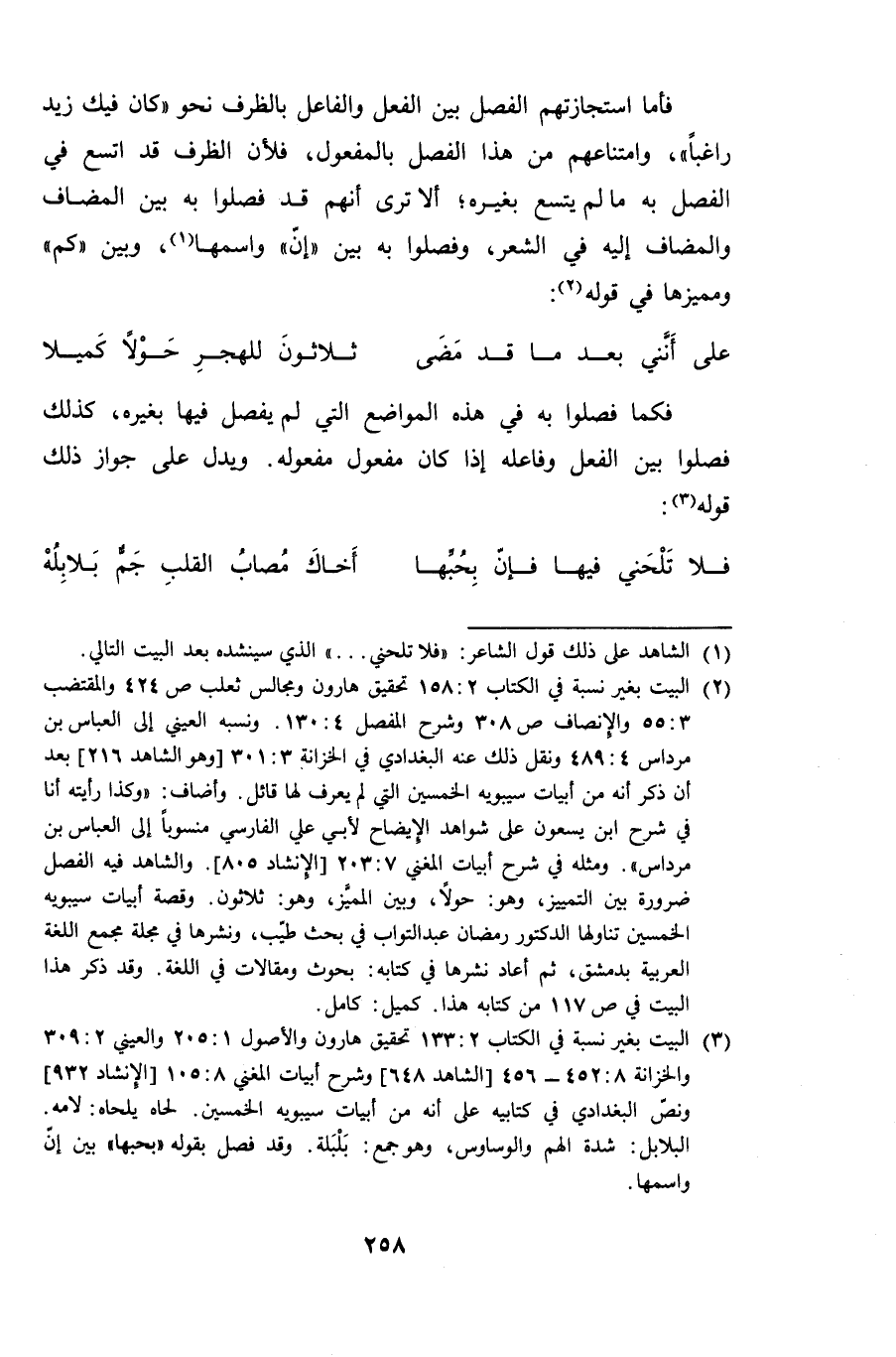 فأما استجازتهم الفصل بين الفعل والفاعل بالظرف نحو "كان فيك زيد راغباً"، وامتناعهم من هذا الفصل بالمفعول، فلأن الظرف قد اتسع في الفصل به ما لم يتسع بغيره؛ ألا ترى أنهم قد فصلوا به بين المضاف والمضاف إليه في الشعر، وفصلوا به بين "إن" واسمها، وبين "كم" ومميزها في قوله: