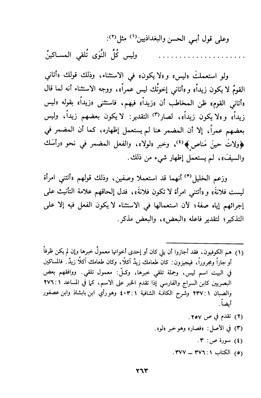 ولو استعملت "ليس" و "لا يكون" في الاستثناء، وذلك قولك "أتأني القومُ لا يكون زيداً" و "أتاني إخوتُك ليس عمراً"، ووجه الاستثناء أنه لما قال "أتاني القوم" ظن المخاطب أن "زيداً" فيهم، فاستثنى "زيداً" بقوله "ليس زيداً" و "لا يكون زيداً"، لصار التقدير: لا يكون بعضهم زيداً، وليس بعضهم عمراً، إلا أن المضمر هنا لم يستعمل إظهاره، كما أن المضمر في {ولات حين مناصٍ}، وخبر "لولا"، والفعل المضمر في نحو "رأسك والسيف"، لم يستعمل إظهار شيء من ذلك.