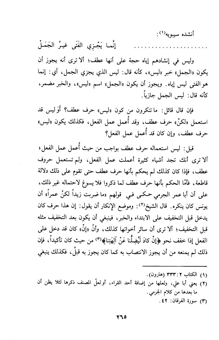 قيل: ليس استعماله حرف عطف بواجب من حيث أُعمل عمل الفعل؛ ألا ترى أنك تجد أشياء كثيرة أعملت عمل الفعل، ولم تستعمل حروف عطف، فإذا كان كذلك لم يحكم بأنها حرف عطف حتى تقوم على ذلك دلالة قاطعة، فأما الحكم بأنها حرف عطف لما ذكروا فلا يسوغ لاحتماله غير ذلك، على أن أبا عمر الجرم يحكى في قولهم "ما ضربت زيداً لكن عمراً" أن يونس كان ينكره. قال الشيخ: وموضع الإنكار أن يقول: إن هذا حرف كان يدخل قبل التخفيف على الابتداء والخبر، فينبغي أن يكون بعد التخفيف مثله قبل التخفيف؛ ألا ترى أن سائر أخواتها كذلك، وأن "إن" كان قد دخل على الفعل إذا خفف نحو {إن كان ليضلنا عن آلهتنا} من حيث كان تأكيداً، فإن ذلك لم يمنعه من أن يجوز الانتصاب به كما كان يجوز به قبل، فكذلك ينبغي