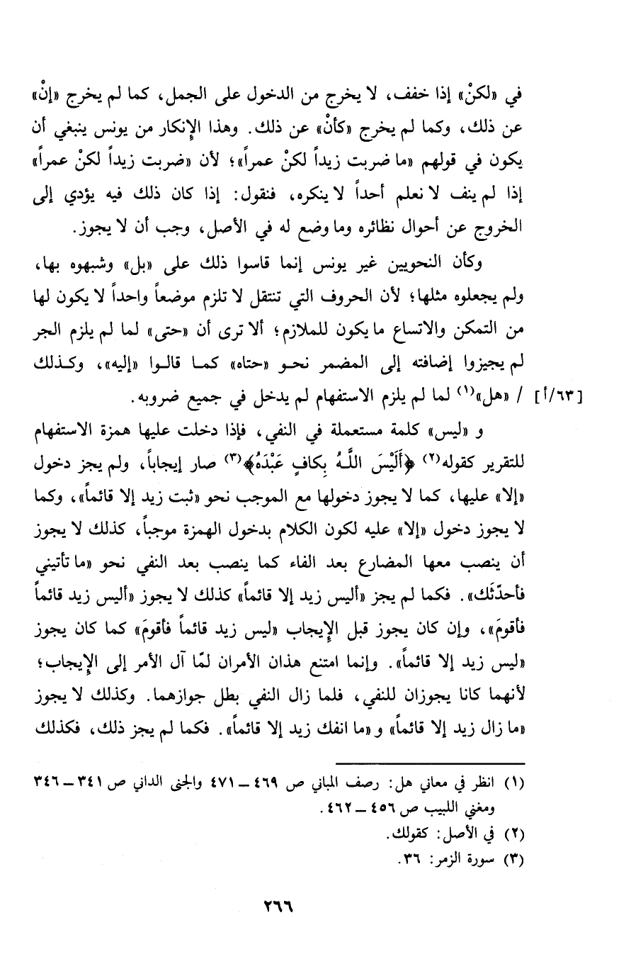 و"ليس" كلمة مستعملة في النفي، فإذا دخلت عليها همزة الاستفهام للتقرير كقوله {أليس الله بكافٍ عبده} صار إيجاباً، ولم يجز دخول "إلا" عليها، كما لا يجوز دخولها مع الموجب نحو "ثبت زيد إلا قائماً"، وكما لا يجوز دخول "إلا" عليه لكون الكلام بدخول الهمزة موجباً، كذلك لا يجوز أن ينصب معها المضارع بعد الفاء كما ينصب بعد النفي نحو "ما تأتيني فأحدثك". فكما لم يجز "أليس زيد إلا قائماً" كذلك لا يجوز "أليس زيد قائماً فأقوم"، وإن كان يجوز قبل الإيجاب "ليس زيد قائماً فأقوم" كما كان يجوز "ليس زيد إلا قائماً". وإنما امتنع هذان الأمران لما آل الأمر إلى الإيجاب؛ لأنهما كانا يجوزان للنفي، فلما زال النفي بطل جوازهما. وكذلك لا يجوز "ما زال زيد إلا قائماً" و "ما انفك زيد إلا قائماً". فكما لم يجز ذلك، فكذلك