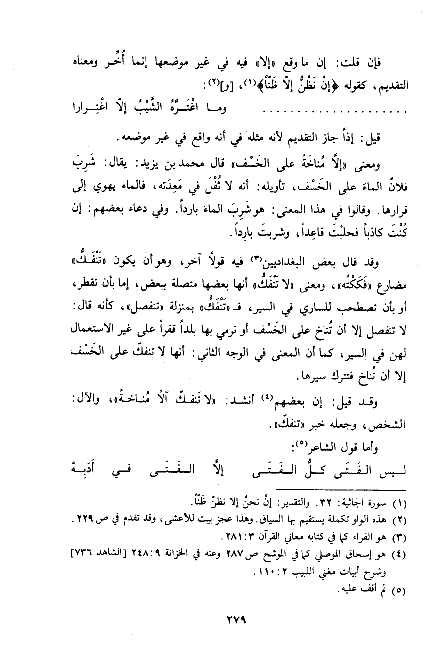 فإن قلت: إن ما وقع "إلا" فيه في غير موضعها إنما أُخر ومعناه التقديم، كقوله {إن نظن إلا ظناً}، [و]: