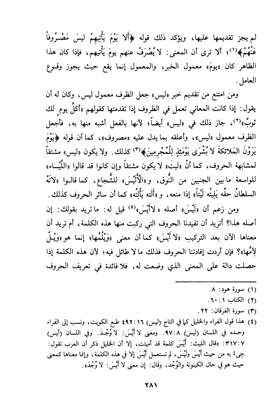 ومن امتنع من تقديم خبر "ليس" جعل الظرف معمول ليس، وكان له أن يقول: إذا كانت المعاني تعمل في الظروف إذا تقدمتها كقولهم "أكل يومٍ لك ثوبٌ"، جاز ذلك في "ليس" أيضاً؛ لأنها بالفعل أشبه منها به، فأجعل الظرف معمول "ليس"، وأعلقه بما يدل عليه "مصروف"، كما أن قوله {يوم يرون الملائكة لا بشرى يومئذٍ للمجرمين} كذلك. ولا يكون "ليس" مشتقاً لمشابهة الحروف، كما أن "ليت" لا يكون مشتقاً وإن كانوا قد قالوا "الليساء" للواسعة ما بين الجنبين من النُّوق، و "الأليس" للشجاع، كما قالوا "لاته السلطان حقه يليته ليتاً" إذا منعه، و "ألته يألته" كما أن سائر الحروف كذلك.