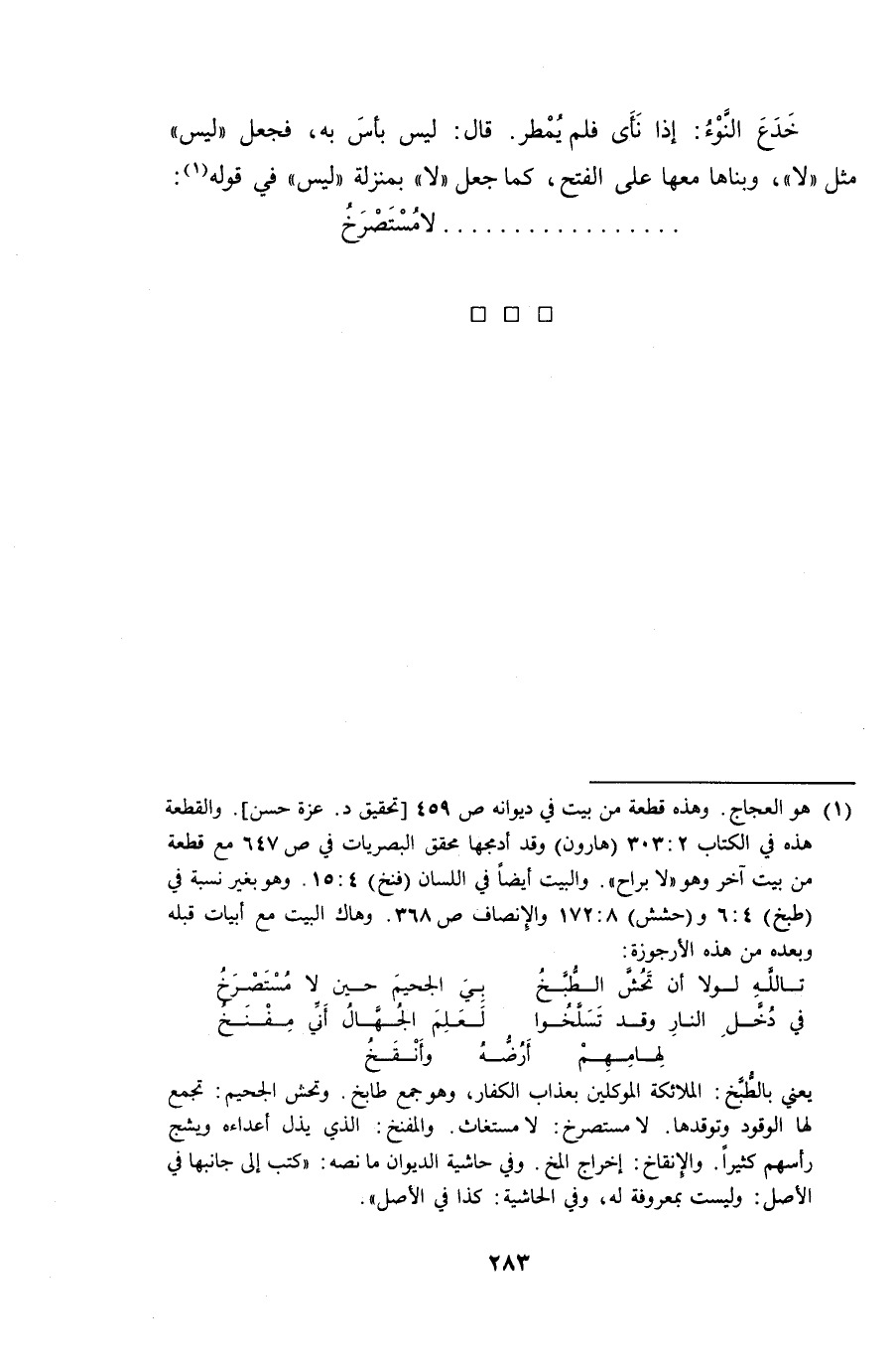 خدع النوءُ: إذا نأى فلم يُمطر. قال: ليس بأس به، فجعل "ليس" مثل "لا"، وبناها معها على الفتح، كما جعل "لا" بمنزلة "ليس" في قوله: