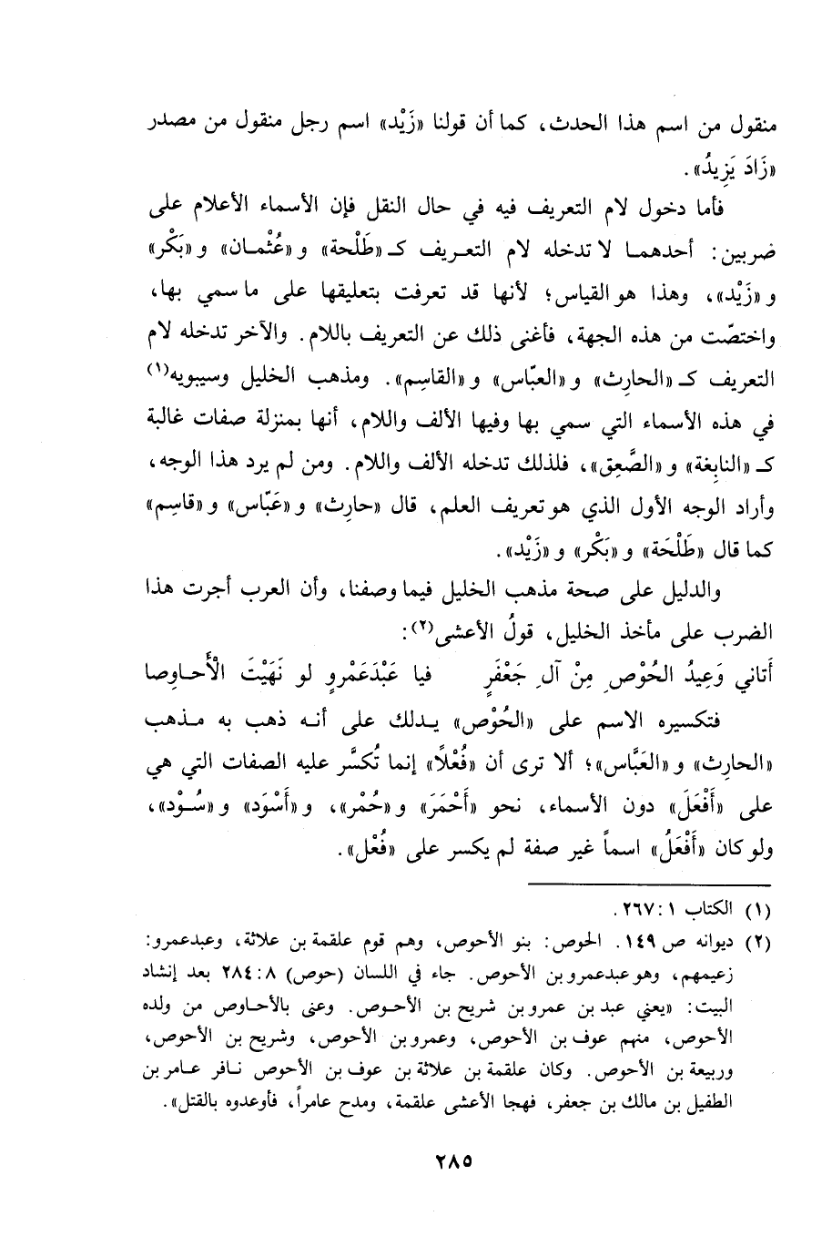 فتكسيه الاسم على "الحُوص" يدلك على أنه ذهب به مذهب "الحارث" و "العباس"؛ ألا ترى أن "فُعلاً" إنما تُكسر عليه الصفات التي هي على "أفعل" دون الأسماء، نحو "أحمر" و "حُمر"، و "أسود" و "سُود"، ولو كان "أفعلُ" اسماً غير صفة لم يكسر على "فُعل".