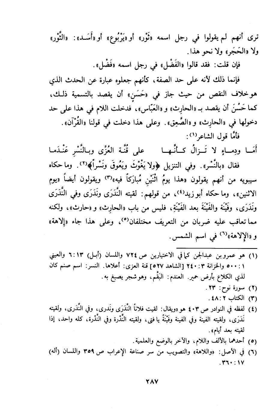 فقال "بالنسر". وفي التنزيل {ولا يغوث ويعوق ونسرا}. وما حكاه سيبويه من أنهم يقولون "هذا يوم اثنين مباركاً فيه" ويقولون أيضاً "يوم الاثنين"، وما حكاه أبو زيد، من قولهم: لقيته الندرى وندرى وفي الندرى وندرى، وفينة والفينة بعد الفينة، فليس من باب "الحارث" و "حارث"، ولكنه مما تعاقب عليه ضربان من التعريف مختلفان، وعلى هذا جاء "إلاهة" و "الإلاهة" في اسم الشمس.