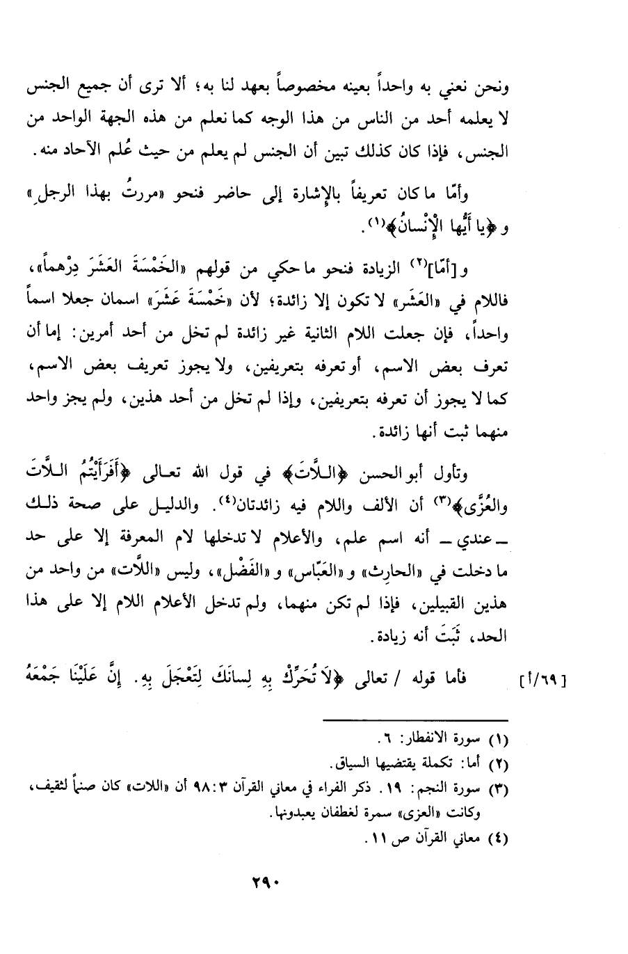 وتأول أبو الحسن {اللات} في قول الله تعالى {أفرأيتم اللات والعُزى} أن الألف واللام فيه زائدتان. والدليل على صحة ذلك -عندي- أنه اسم علم، والأعلام لا تدخلها لام المعرفة إلا على حد ما دخلت في "الحارث" و "العباس" و "الفضل"، وليس "اللات" من واحد من هذين القبيلين، فإذا لم تكن منهما، ولم تدخل الأعلام اللام إلا على هذا الحد، ثبت أنه زيادة.