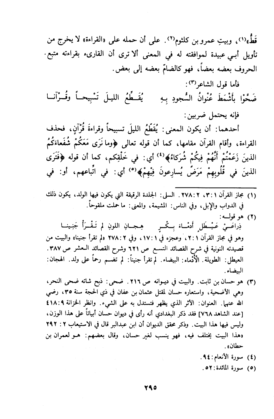 قط"، وبيت عمرو بن كلثوم. على أن حمله على "القراءة" لا يخرج من تأويل أبي عبيدة لموافقته له في المعنى ألا ترى أن القارئ بقراءته متبع الحروف بعضه بعضاً، فهو كالضام بعضه إلى بعض.