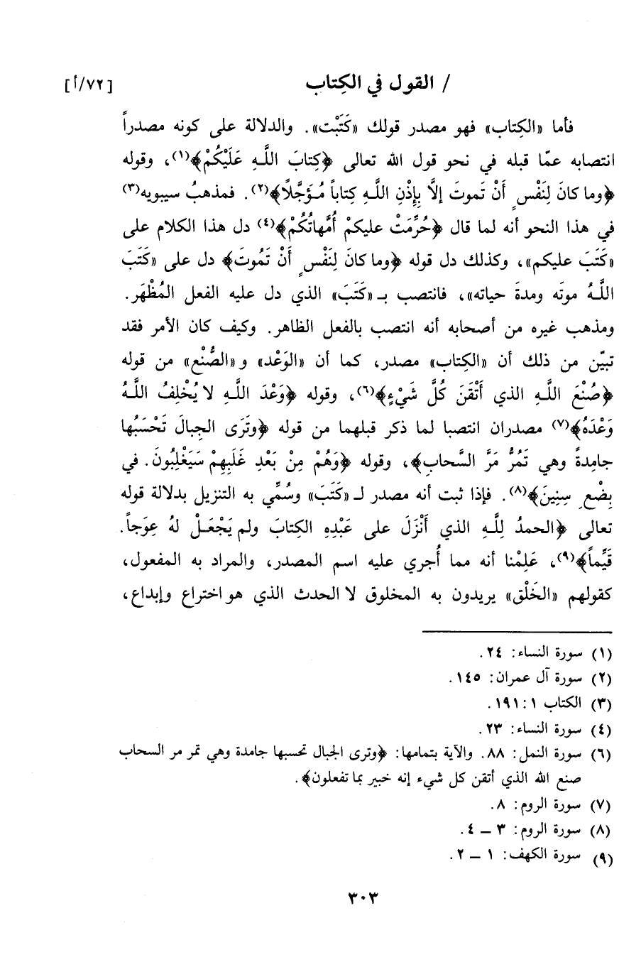 فأما "الكتاب" فهو مصدر قولك "كتبت". والدلالة على كونه مصدراً انتصابه عما قبله في نحو قول الله تعالى {كتاب الله عليكم}، وقوله {وما كان لنفسٍ أن تموت إلا بإذن الله كتاباً مؤجلاً}. فمذهب سيبويه في هذا النحو أنه لما قال {حُرِّمت عليكم أمهاتكم} دل هذا الكلام على "كتب عليكم"، وكذلك دل قوله {وما كان لنفسٍ أن تموت} دل على "كتب الله موته ومدة حياته"، فانتصب بـ"كتب" الذي دل عليه الفعل المظهر. ومذهب غيره من أصحاب أنه انتصب بالفعل الظاهر. وكيف كان الأمر فقد تبين من ذلك أن "الكتاب" مصدر، كما أن "الوعد" و"الصنع" من قوله {صنع الله الذي أتقن كل شيءٍ}، وقوله {وعد الله لا يخلف الله وعده} مصدران انتصبا لما ذكر قبلهما من قوله {وترى الجبال تحسبها جامدة وهي تمر مر السحاب}، وقوله {وهم من بعد غلبهم سيغلبون. في بضع سنين}. فإذا ثبت أنه مصدر لـ"كتب" وسمي به التنزيل بدلالة قوله تعالى {الحمد لله الذي أنزل على عبده الكتاب ولم يجعل له عوجا. قيماً}، علمنا أنه مما أجري عليه اسم المصدر، والمراد به المفعول كقولهم "الخلق" يريدون به المخلوق لا الحدث الذي هو اختراع وإبداع،
