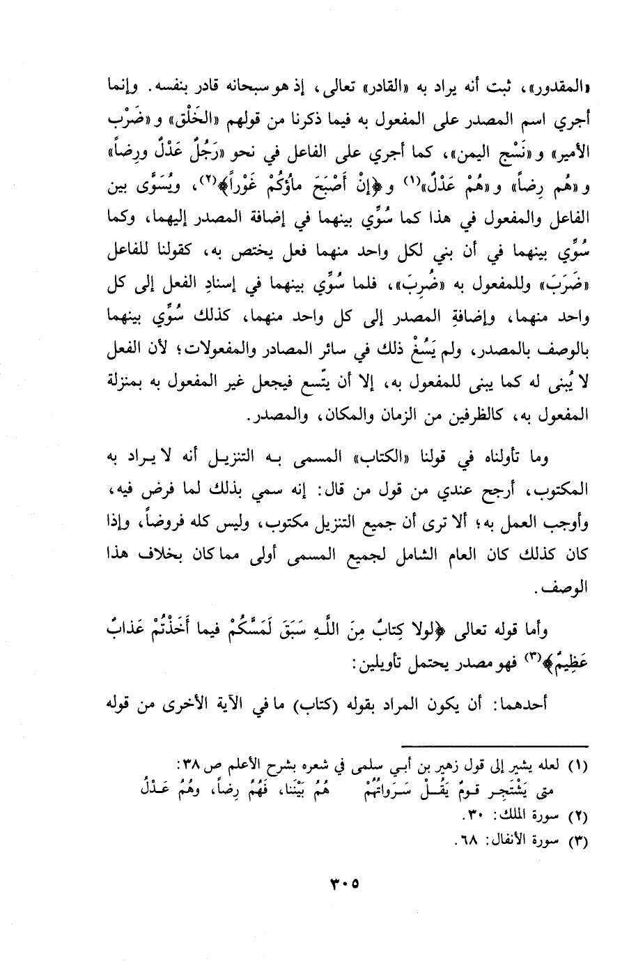 "المقدور"، ثبت أنه يراد به "القادر" تعالى، إذ هو سبحانه قادر بنفسه. وإنما أجري اسم المصدر على المفعول به فيما ذكرنا من قولهم "الخلق" و"ضرب الأمير" و"نسج اليمن"، كما أجري على الفاعل في نحو "رجلٌ عدلٌ ورضاً" و"هم رضاً" و"هم عدلٌ" و {إن أصبح ماؤكم غوراً}، ويسوي بين الفاعل والمفعول في هذا كما سوي بينهما في إضافة المصدر إليهما، وكما سوي بينهما في أن بني لكل واحد منهما فعل يختص به، كقولنا للفاعل "ضرب" وللمفعول به "ضرب"، فلما سوي بينهما في إسناد الفعل إلى كل واحد منهما، وإضافة المصدر إلى كل واحد منهما، كذلك سوي بينهما بالوصف بالمصدر، ولم يسغ ذلك في سائر المصادر والمفعولات؛ لأن الفعل لا يُبنى له كما يبنى للمفعول به، إلا أن يتسع فيجعل غير المفعول به بمنزلة المفعول به، كالظرفين من الزمان والمكان، والمصدر.