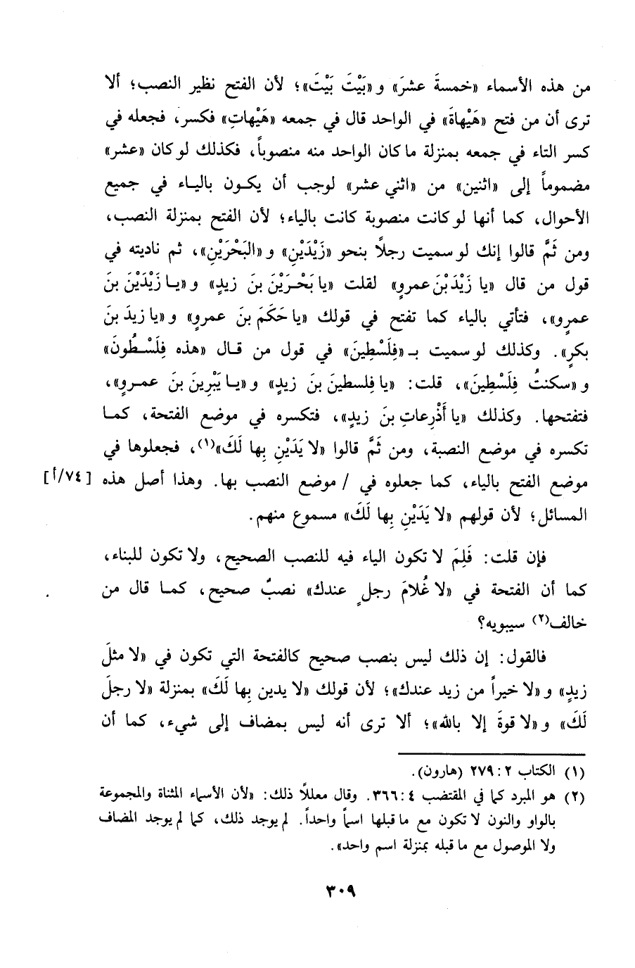 من هذه الأسماء "خمسة عشر" و"بيت بيت"؛ لأن الفتح نظير النصب؛ ألا ترى أن من فتح "هيهاة" في الواحد قال في جمعه "هيهات" فكسر، فجعله في كسر التاء في جمعه بمنزلة ما كان الواحد منه منصوباً، فكذلك لاو كان "عشر" مضموماً إلى "اثنين" من "اثني عشر" لوجب أن يكون بالياء في جميع الأحوال، كما أنها لو كانت منصوبة كانت بالياء؛ لأن الفتح بمنزلة النصب، ومن ثم قالوا إنك لو سميت رجلاً بنحو "زيدين" و "البحرين" ثم ناديته في قول من قال "يا زيد بن عمروٍ" لقلت "يا بحرين بن زيدٍ" و"يا زيدين بن بكرٍ". وكذلك لو سميت بـ"فلسطين" في قول من قال "هذه فلسطون" و"سكنت فلسطين"، قلت: "يا فلسطين بن زيدٍ" و"يا يبرين بن عمروٍ"، فتحتها. وكذلك "يا أذرعات بن زيدٍ"، فتكسره في موضع الفتحة، كما تكسره في موضع النصبة، ومن ثم قالوا "لا يدين بها لك"، فجعلوها في موضع الفتح بالياء، كما جعلوه في موضع النصب بها. وهذا أصل هذه المسائل؛ لأن قولهم "لا يدين بها لك" مسموع منهم.