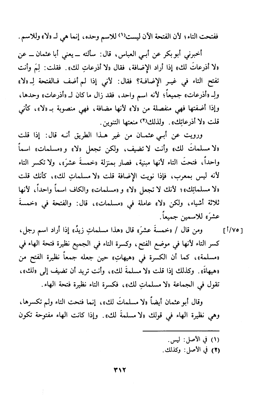 وقال أبو عثمان أيضاً "لا مسلمات لك"، إنما فتحت التاء ولم تكسرها، وهي نظيرة الهاء في قولك "لا مسلمة لك". وإذا كانت الهاء مفتوحة تكون