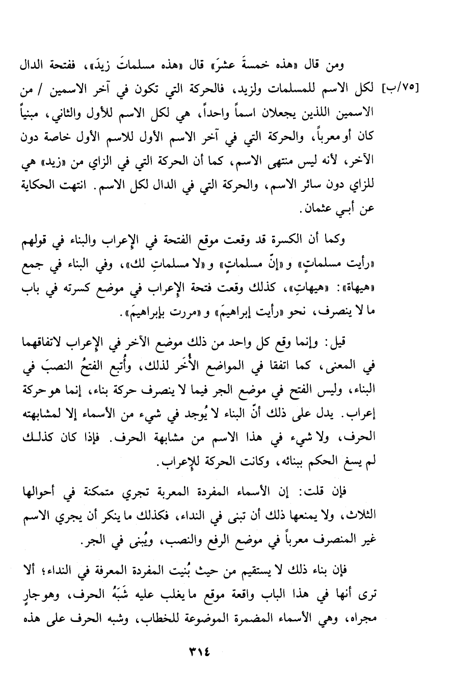 ومن قال "هذه خمسة عشر" قال "هذه مسلمات زيد" ففتحة الدال لكل الاسم للمسلمات ولزيد، فالحركة التي تكون في آخر الاسمين من الاسمين اللذين يجعلان اسماً واحداً، هي لكل الاسم للأول والثاني، مبنياً كان أو معرباً، والحركة التي في آخر الاسم الأول للاسم الأول خاصة دون الآخر، لأنه ليس منتهى الاسم، كما أن الحركة التي في الزاي من "زيد" هي للزاي دون سائر الاسم، والحركة التي في الدال لكل الاسم. انتهت الحكاية عن أبي عثمان.