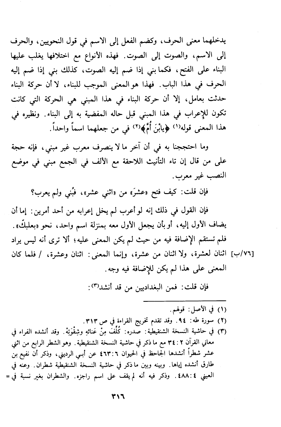 فإن قلت: كيف فتح "عشر" من "اثني عشر"، فبني ولم يعرب؟