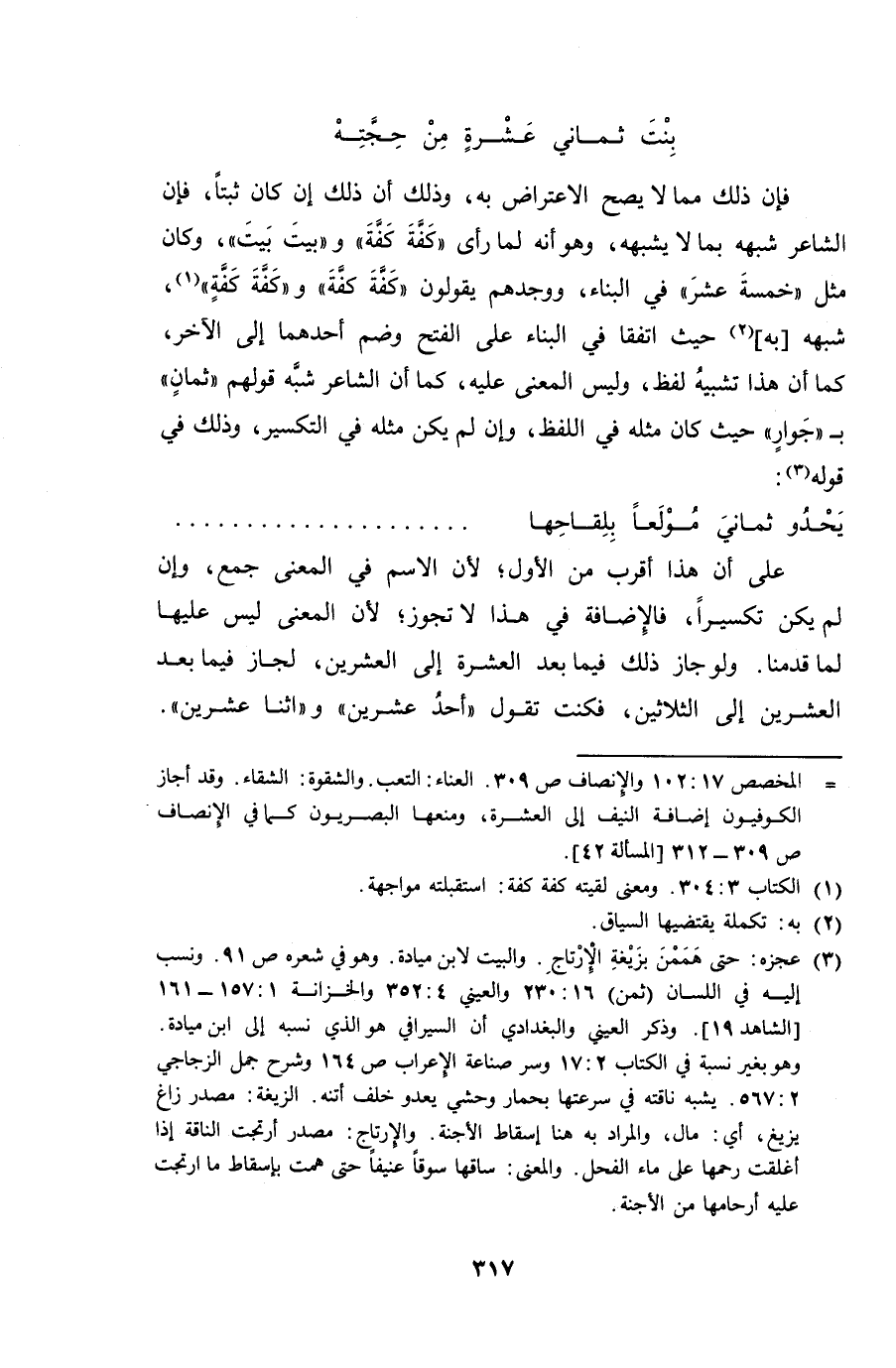 فإن ذلك مما لا يصح الاعتراض به، وذلك أن ذلك إن كان ثبتاً، فإن الشاعر شبهه بما لا يشبهه، وهو أنه لما رأى "كفة كفة" و"بيت بيت"، وكان مثل "خمسة عشر" في البناء، ووجدهم يقولون "كفة كفة" و"كفةَ كفةٍ"، شبهه [به] حيث اتفقا في البناء على الفتح وضم أحدهما إلى الآخر، كما أن هذا تشبيه لفظ، وليس المعنى عليه، كما أن الشاعر شبه قولهم "ثمانٍ" بـ"جوارٍ" حيث كان مثله في اللفظ، وإن لم يكن مثله في التكسير، وذلك في قوله: