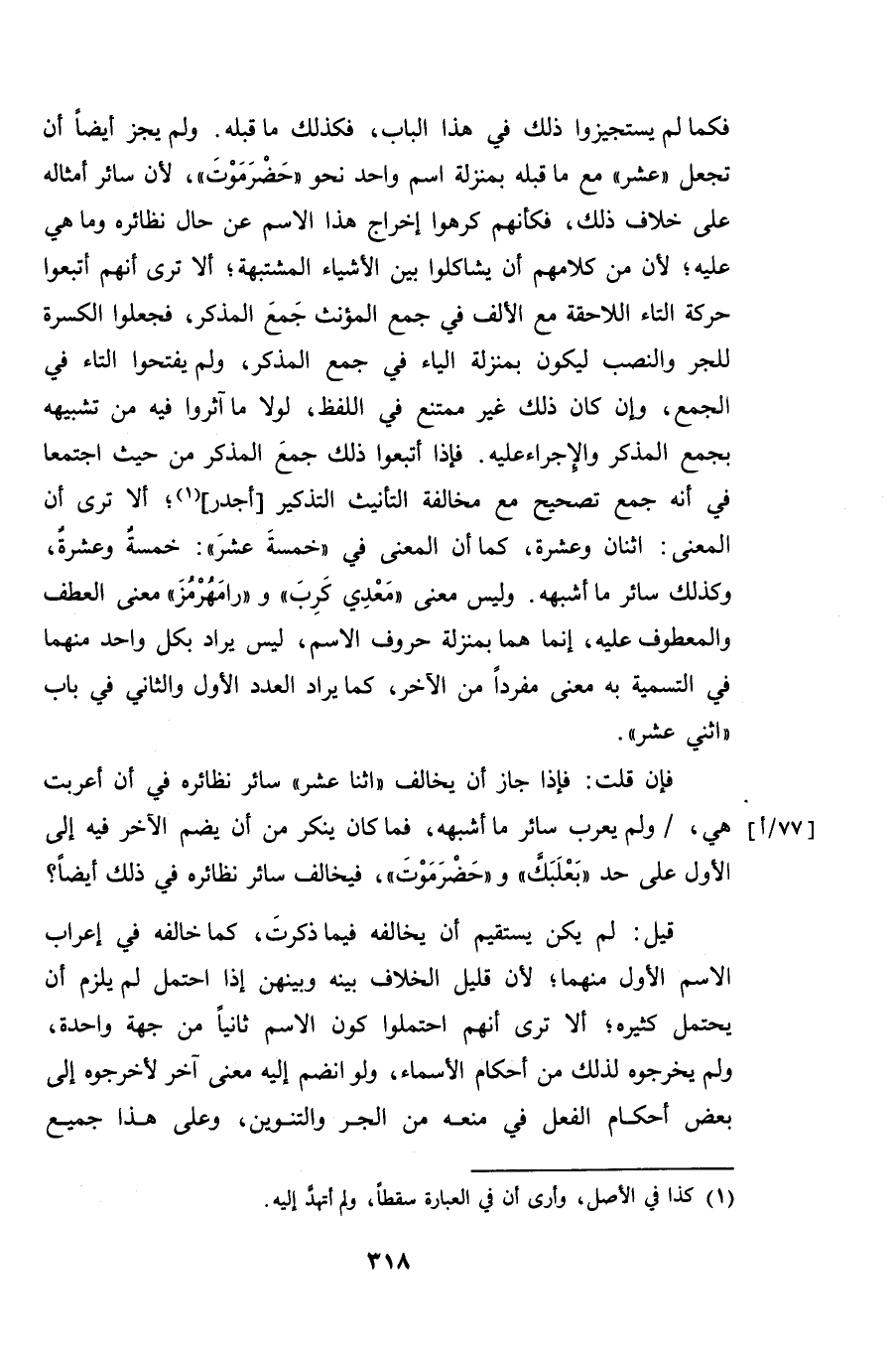 فكما لم يستجيروا ذلك في هذا الباب، فكذلك ما قبله. ولم يجز أيضاً أن تجعل "عشر" مع ما قبله بمنزلة اسم واحد نحو "حضرموت"، لأن سائر أمثال على خلاف ذلك، فكأنهم كرهوا إخراج هذا الاسم عن حال نظائره وما هي عليه؛ لأن من كلامهم أن يشاكلوا بين الأشياء المشتبهة؛ ألا ترى أنهم أتبعوا حركة التاء اللاحقة مع الألف في جمع المؤنث جمع المذكر، فجعلوا الكسرة للجر والنصب ليكون بمنزلة الياء في جمع المذكر، ولم يفتحوا التاء في الجمع، وإن كان ذلك غير ممتنع في اللفظ، لولا ما آثروا فيه من تشبيهه بجمع المذكر والإجراء عليه. فإذا أتبعوا ذلك جمع المذكر من حيث اجتمعا في أنه جمع تصحيح مع مخالفة التأنيث التذكير [أجدر]؛ الا ترى أن المعنى: اثنان وعشرة، كما أن المعنى في "خمسة عشر": خمسةٌ وعشرةٌ، وكذلك سائر ما أشبهه. وليس معنى "مَعدي كرب" و "رامهرمز" معنى العطف والمعطوف عليه، إنما هما بمنزلة حروف الاسم، ليس يراد بكل واحد منهما في التسمية به معنى مفرداً من الآخر، كما يراد العدد الأول والثاني في باب "اثني عشر".