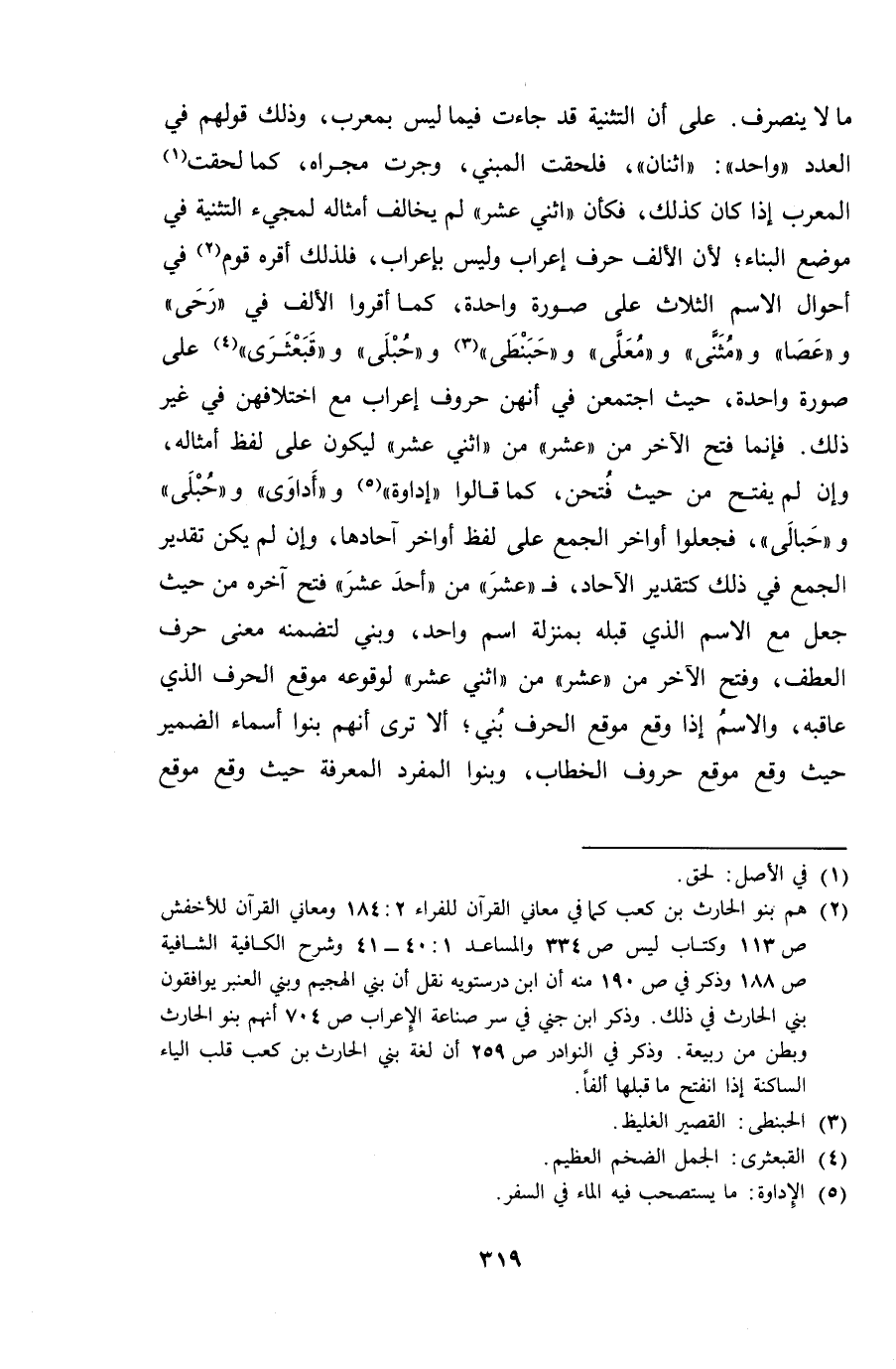 ما لا ينصرف. على أن التثنية قد جاءت فيما ليس بمعرب، وذلك قولهم في العدد "واحد": "اثنان"، فلحقت المبني، وجرت مجراه، كما لحقت المعرب إذا كان كذلك، فكأن "اثني عشر" لم يخالف أمثاله لمجيء التثنية في موضع البناء؛ لأن الألف حرف إعراب وليس بإعراب، فلذلك أقره قوم في أحوال الاسم الثلاث على صورة واحدة، كما أقروا الألف في "رحى" و"عصا" و"مُثنى" و"معلى" و"حبنطي" و"حبلى" و"قبعثرى" على صورة واحدة، حيث اجتمعن في أنهن حروف إعراب مع اختلافهن في غير ذلك. فإنما فتح الآخر من "عشر" من "اثني عشر" ليكون على لفظ أمثاله، وإن لم يفتح من حيث فُتحن، كما قالوا "إداوة" و"أداوى" و"حُبلى" و"حبالى"، فجعلوا أواخر الجمع على لفظ أواخر آحادها، وإن لم يكن تقدير الجمع في ذلك كتقدير الآحاد، فـ"عشر" من "أحد عشر" فتح آخره من حيث جعل مع الاسم الذي قبله بمنزلة اسم واحد، وبني لتضمنه معنى حرف العطف، وفتح الآخر من "عشر" من "انثى عشر" لوقوعه موقع الحرف الذي عاقبه، والاسم إذا وقع موقع الحرف بُني؛ ألا ترى أنهم بنوا أسماء الضمير حيث وقع موقع حروف الخطاب، وبنوا المفرد المعرفة حيث وقع موقع