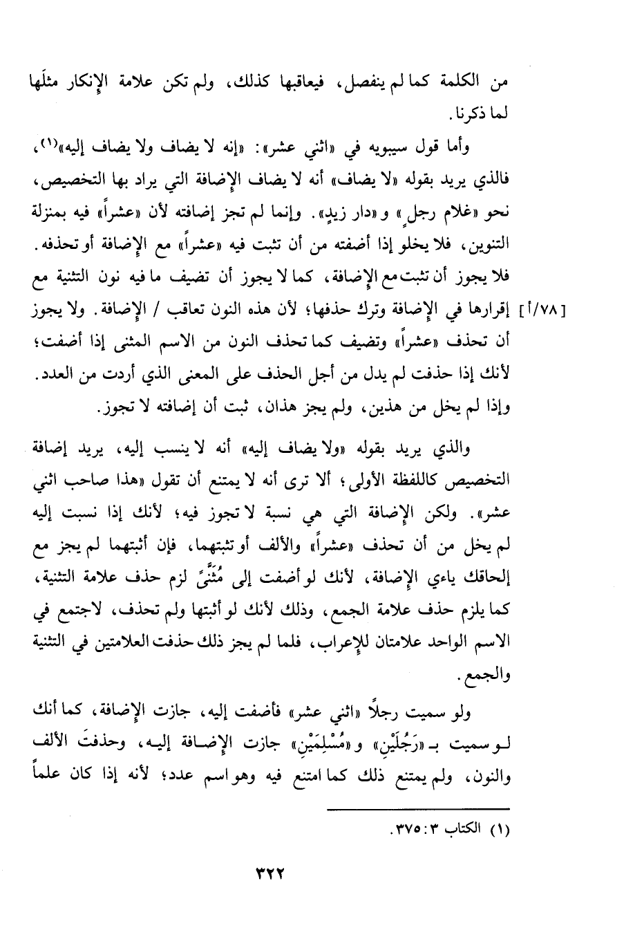 وأما قول سيبويه في "اثني عشر": "إنه لا يضاف ولا يضاف إليه"، فالذي يريد بقوله "لا يضاف" أنه لا يضاف الإضافة التي يراد بها التخصيص، نحو "غلام رجلٍ" و"دار زيدٍ". وإنما لم تجز إضافته لأن "عشراً" فيه بمنزلة التنوين، فلا يخلو إذا أضفته من أن تثبت فيه "عشراً" مع الإضافة أو تحذفه. فلا يجوز أن تثبت مع الإضافة، كما لا يجوز أن تضيف ما فيه نون التثنية مع إقرارها في الإضافة وترك حذفها؛ لأن هذه النون تعاقب الإضافة. ولا يجوز أن تحذف "عشراً" وتضيف كما تحذف النون من الاسم المثنى إذا أضفت؛ لأنك إذا حذفت لم يدل من أجل الحذف على المعنى الذي أردت من العدد. وإذا لم يخل من هذين، ولم يجز هذين، ولم يجز هذان، ثبت أن إضافته لا تجوز.