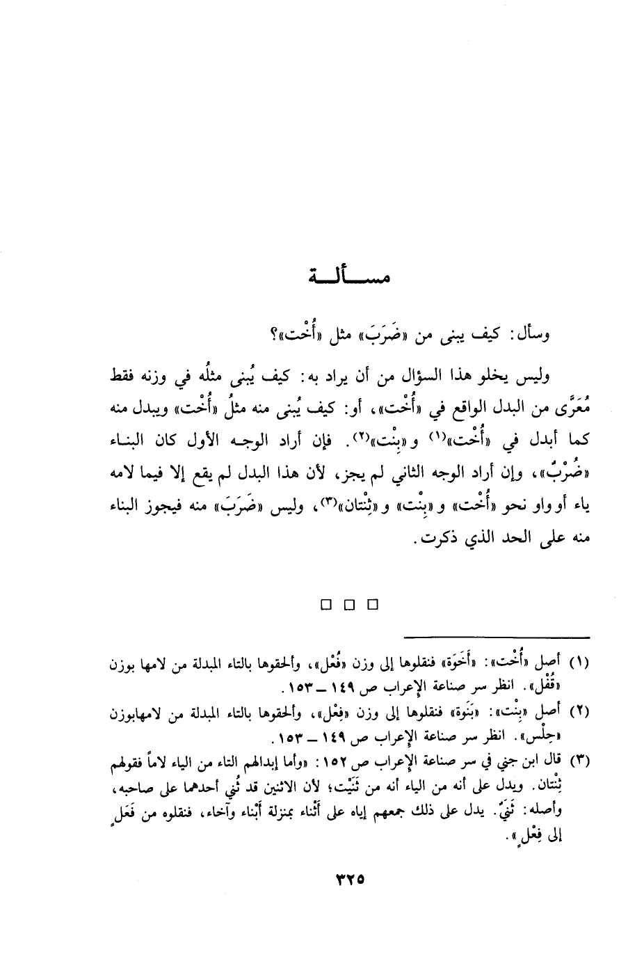 وليس يخلو هذا السؤال من أن يراد به: كيف يُبنى مثله في وزنه فقط مُعَرَّى من البدل الواقع في "أخت"، أو: كيف يُبنى منه مثل "أخت" ويبدل منه كما أبدل في "أخت" و"بنت". فإن أراد الوجه الأول كان البناء "ضربٌ"، وإن أراد الوجه الثاني لم يجز، لأن هذا البدل لم يقع إلا فيما لامه ياء أو واو نحو "أخت" و "بنت" و"ثنيتان"، وليس "ضرب" منه فيجوز البناء منه على الحد الذي ذكرت.