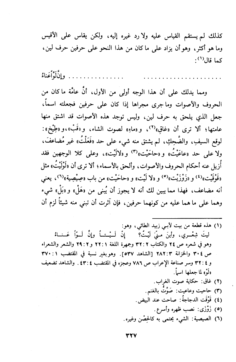 ومما يدلك على أن هذا الوجه أولى من الأول، أن عامة ما كان من الحروف والأصوات وما جرى مجراها إذا كان على حرفين فجعلته اسماً، جعل الذي يلحق به حرف لين، وليس توجد هذه الأصوات قد اشتق منها عامتها؛ ألا ترى أن "غاق"، "وماء" لصوت الشاء، و"قب" و "طيخ": لوقع السيف، والضحك، لم يشتق منه شيء على حد "فعلت" غير مضاعف، ولا على حد "عاعيت" و"حاحيت" و "لاليت"، وعلى كلا الوجهين فقد أزيل عنه أحكام الحروف والأصوات، وألحق بالأسماء؛ ألا ترى أن "لوليت" مثل "قوقيت" و"زوزيت" و "لاليت" و "حاحيت" من باب "صيصية"، يعني أنه مضاعف، فهذا مما يبين لك أنه لا يجوز أن يبنى من "هل" و "بل" شيء وهما على ما هما عليه من كونهما حرفين، فإن آثرت أن تبني منه شيئاً لزم أن
