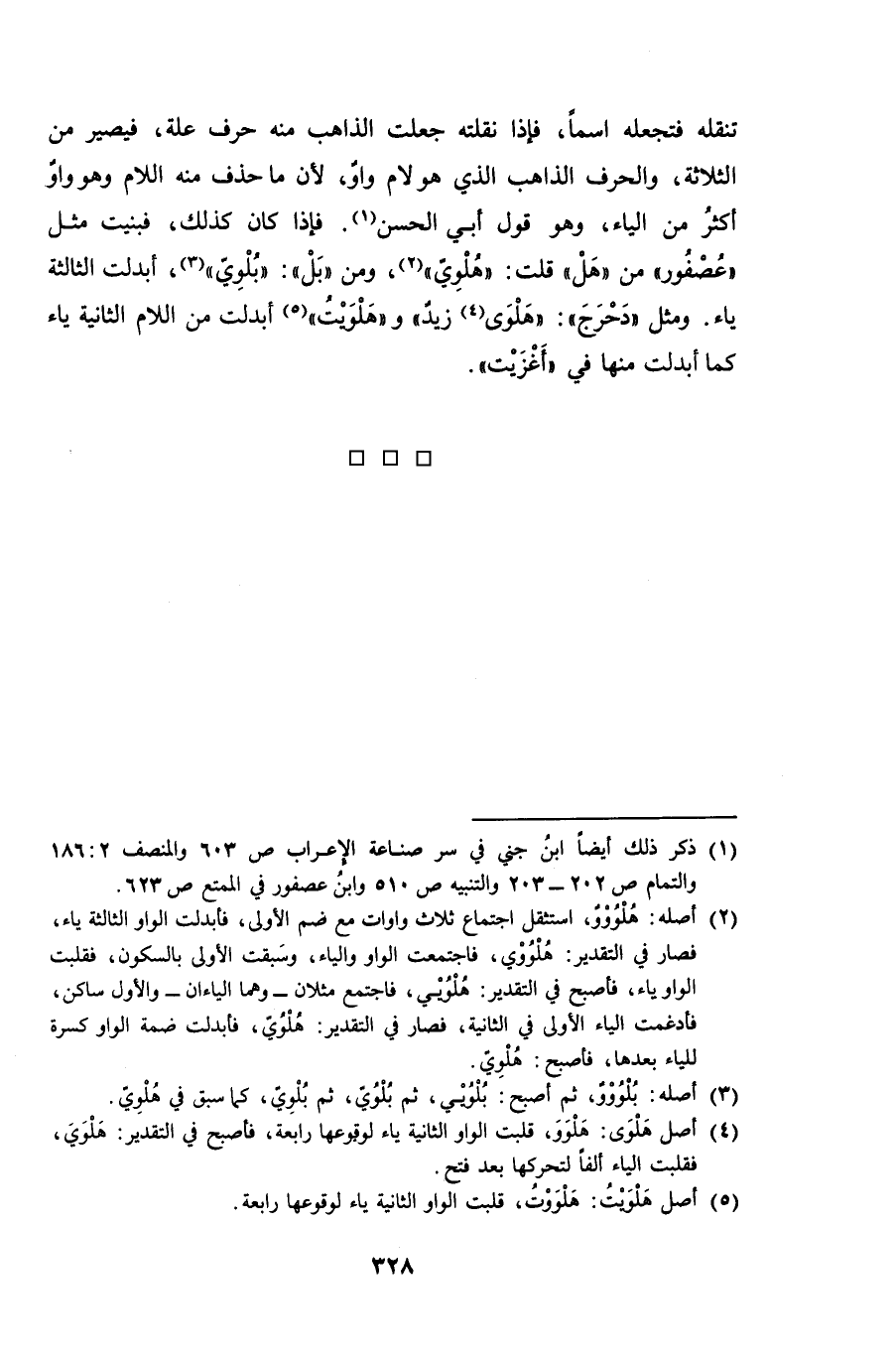 تنقله فتجعله اسماً، فإذا نقلته جعلت الذاهب منه حرف علة، فيصير من الثلاثة، والحرف الذاهب الذي هو لام واوٌ، لأن ما حذف منه اللام وهو واوٌ أكثر من الياء، وهو قول أبي الحسن. فإذا كان كذلك، فبنيت مثل "عصفور" من "هل" قلت: "هلوي"، ومن "بل": "بلوي"، أبدلت الثالثة ياء. ومثل "دحرج": "هلوى زيدٌ" و"هلويت" أبدلت من اللام الثانية ياء كما أبدلت منها في "أغزيت".