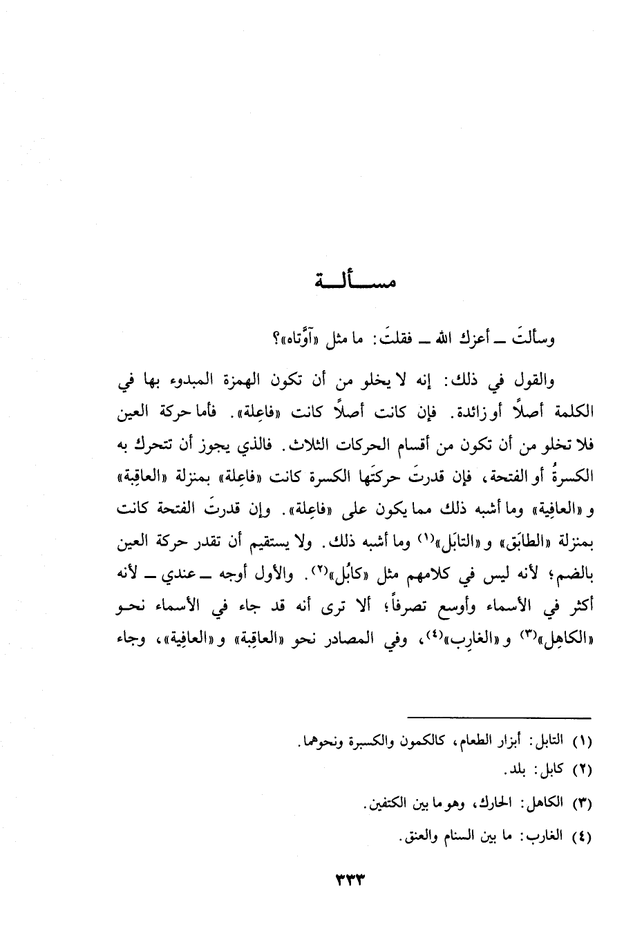 والقول في ذلك: إنه لا يخلو من أن تكون الهمزة المبدوء بها في الكلمة أصلاً أو زائدة. فإن كانت أصلاً كانت "فاعلة". فأما حركة العين فلا تخلو من أن تكون من أقسام الحركات الثلاث. فالذي يجوز أن تتحرك به الكسرة أو الفتحة، فإن قدرت حركتها الكسرة كانت "فاعلة" بمنزلة "العاقبة" و"العافية" وما أشبه ذلك مما يكون على "فاعلة". وإن قدرت الفتحة كانت بمنزلة "الطابق" و"التابل" وما أشبه ذلك. ولا يستقيم أن تقدر حركة العين بالضم؛ لأنه ليس في كلامهم مثل "كابل". والأول أوجه - عندي - لأنه أكثر في الأسماء وأوسع تصرفاً؛ ألا ترى أنه قد جاء في الأسماء نحو "الكاهل" و"الغارب"، وفي المصادر نحو "العاقبة" و"العافية"، وجاء
