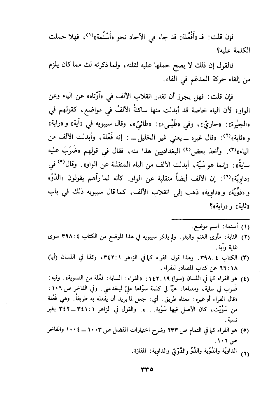 فإن قلت: فهل يجوز أن تقدر انقلاب الألف في "آوتاه" عن الياء وعن اليواو؛ لأن الياء خاصة قد أبدلت منها ساكنةً الألف من مواضع، كقولهم في "الحيرة": "حاري"، وفي "طيِّئ": "طائيّ"، وقال سبويه في "آية" و "راية" و"ثاية": "قال غيره - يعني غير الخليل -: إنه فعلة، وأبدلت الألف من الياء". وأخذ بعض البغداديين هذا منه، فقال في قولهم "ضرب عليه سايةً": "إنما هو سية، أبدلت الألف من الياء المنقلبة عن الواو". وقال في "داويّة": إن الألف أيضاً منقلبة عن الواو. كأنه لما رآهم يقولون "الدو" ودوِّيّة" و"داوية" ذهب إلى انقلاب الألف، كما قال سيبويه ذلك في باب "ثاية" و "راية"؟