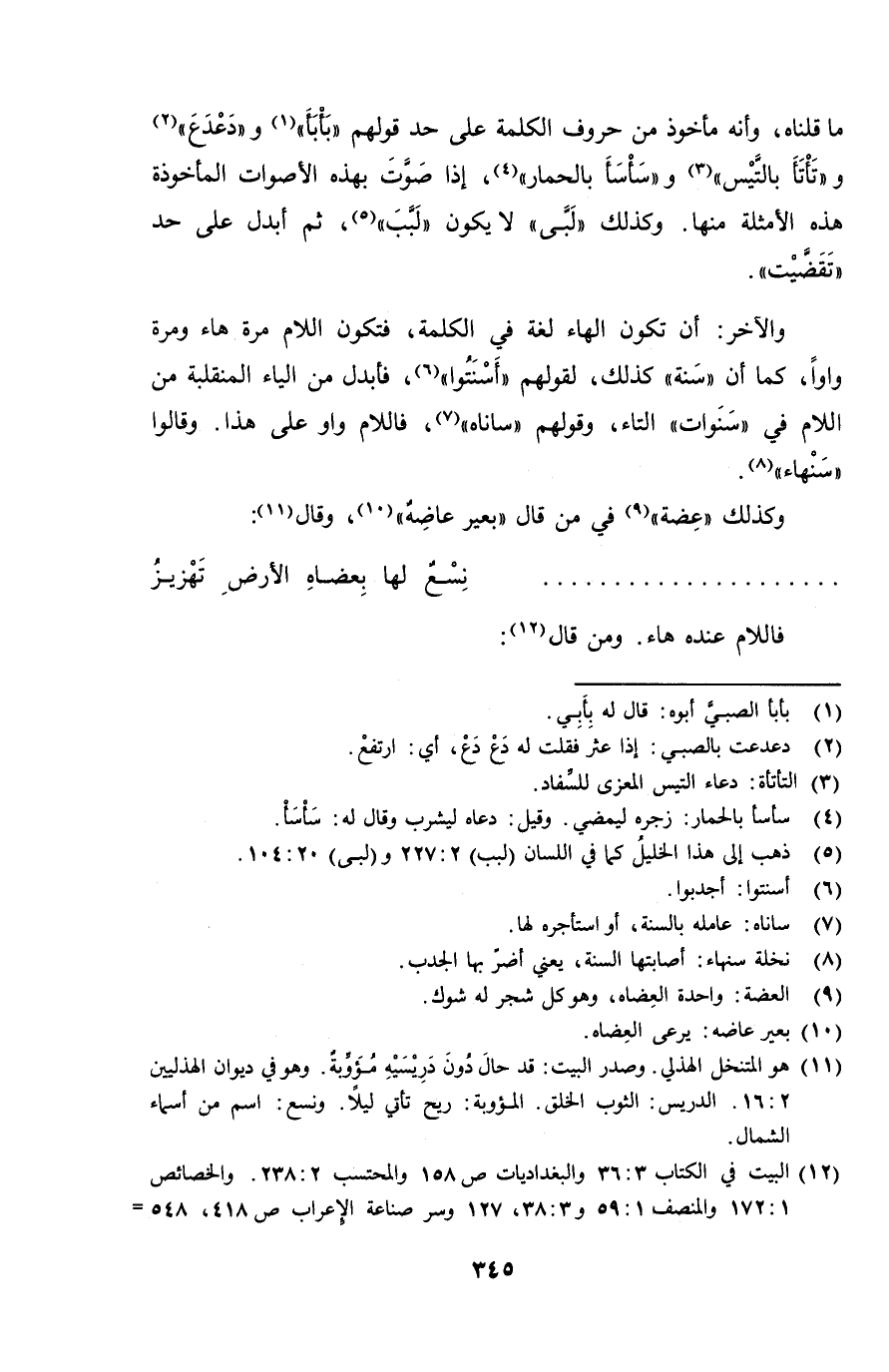 ما قلناه، وأنه مأخوذ من حروف الكلمة على حد قولهم "بأبأ" و "دعدع" و "تأتأ بالتيس" و"سأسأ بالحمار"، إذا صوت بهذه الأصوات المأخوذة هذه الأمثلة منها. وكذلك "لبى" لا يكون "لبب"، ثم أبدل على حد "تقضيب".