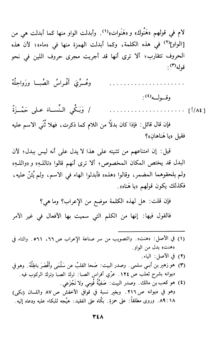 لام في قولهم "هنوك" و "هنوات". وأبدلت الواو منها كما أبدلت هي من [الواو] في هذه الكلمة، وكما أبدلت الهمزة منها في "ماء"؛ لأن هذه الحروف تتقارب؛ الا ترى أنها قد أجريت مجرى حروف اللين في نحو قوله: