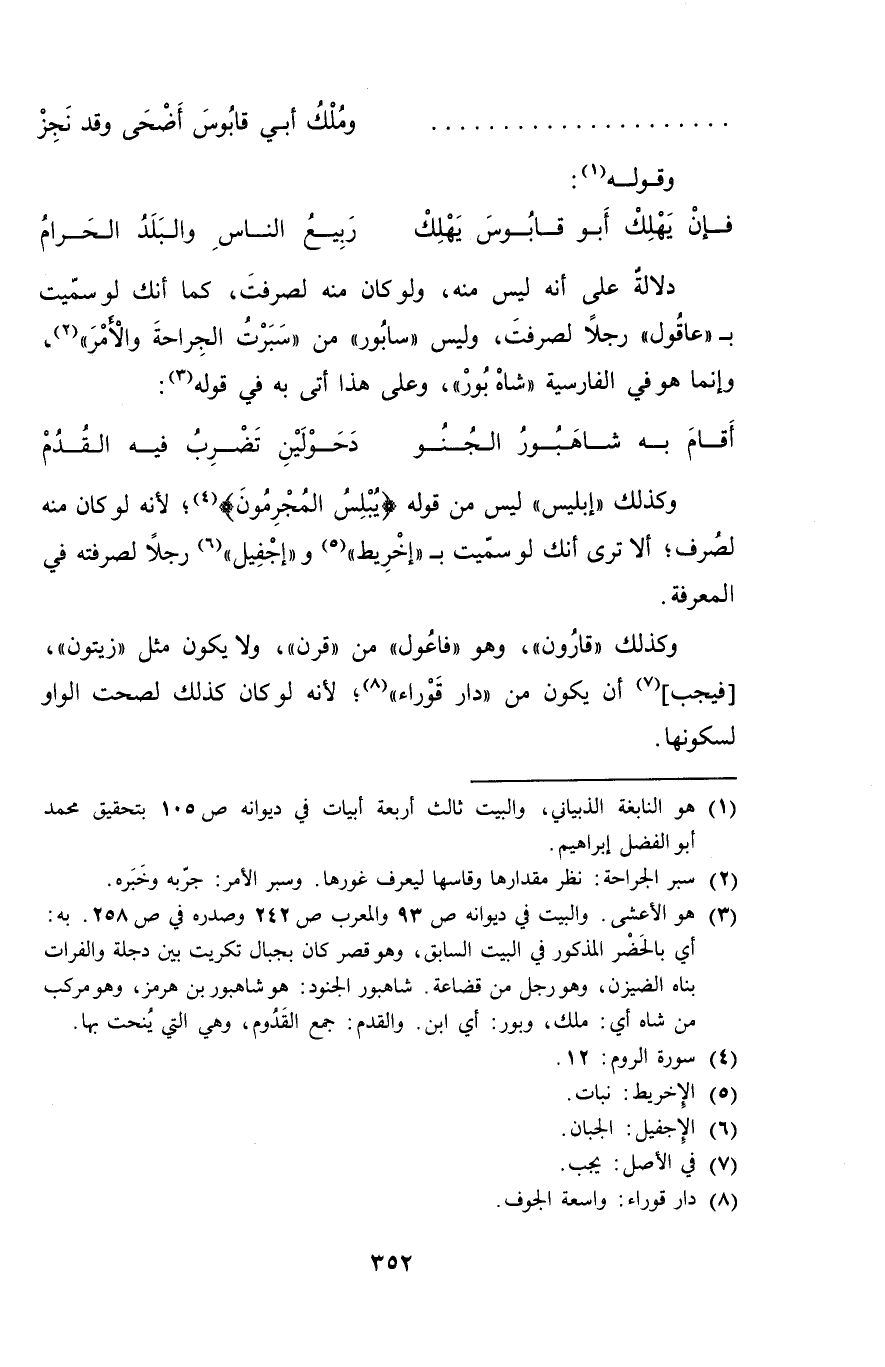 دلالةٌ على أنه ليس منه، ولو كان منه لصرفت، كما أنك لو سميت بـ"عاقول" رجلاً لصرفت، وليس "سابور" من "سبرت الجراحة والأمر"، وإنما هو في الفارسية "شاة بور"، وعلى هذا أتى به في قوله: