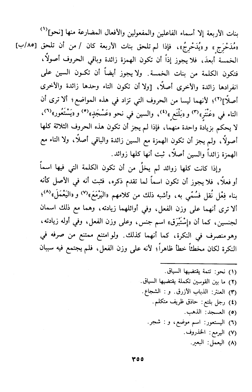 بنات الأربعة إلا أسماء الفاعلين والمفعولين والأفعال المضارعة منها [نحو] "مدحرجٍ" و "يدحرج"، فإذا لم تلحق بنات الأربعة كان من أن تلحق الخمسة أبعد، فلا يجوز إذاً أن تكون الهمزة زائدة وباقي الحروف أصولاً، فتكون الكلمة من بنات الخمسة. ولا يجوز أيضاً أن تكون السين على انفرادها زائدة والأخرى أصلاً، [ولا أن تكون التاء وحدها زائدة والأخرى أصلاً]؛ لأنهما ليسا من الحروف التي تزاد في هذه المواضع؛ ألا ترى أن التاء في "عنترٍ" و"بلتعٍ"، والسين في نحو "عسجدٍ" و "يستعور"، لا يحكم بزيادة واحدة منهما، فإذا لم يجز أن تكون هذا الحروف الثلاثة كلها أصولاً، ولم يجز أن تكون الهمزة مع السين زائدة والباقي أصلاً، ولا التاء مع الهمزة زائداً والسين أصلاً، ثبت أنها كلها زوائد.
