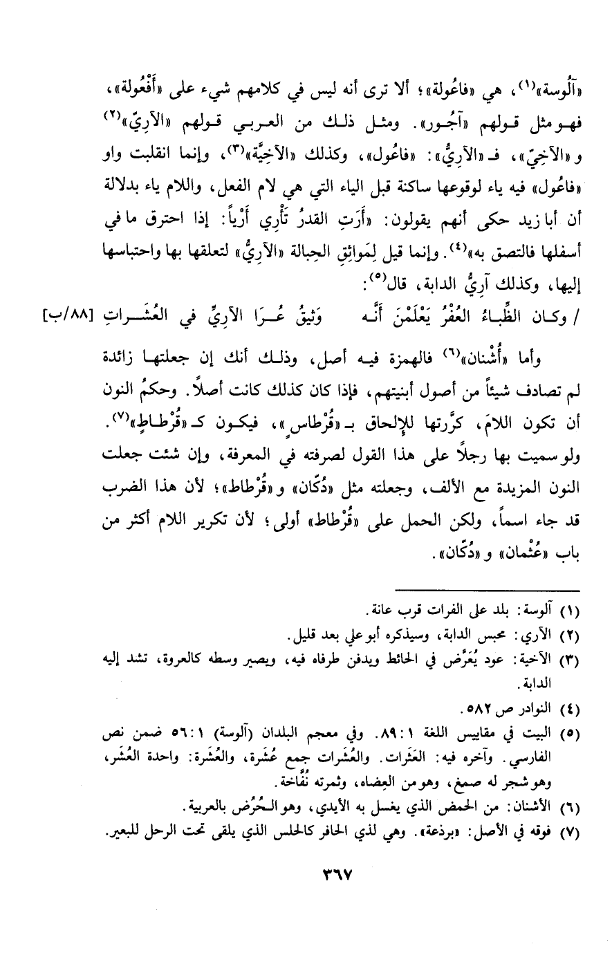 "آلوسة"، هي "فاعولة"؛ ألا ترى أنه ليس في كلامهم شيء على "أفعولة"، فهو مثل قولهم "آجور". ومثل ذلك من العربي قولهم "الآري" و "الآخي"، فـ "الآري": "فاعول"، وكذلك "الآخية"، وإنما انقلبت واو "فاعول" فيه ياء لوقوعها ساكنة قبل الياء التي هي لام الفعل، واللام ياء بدلالة أن أبا زيد حكى أنهم يقولون: "أرت القدرُ تأري أرباً: إذا احترق ما في أسفلها فالتصق به". وإنما قيل لمواثق الحبالة "الآري" لتعلقها بها واحتباسها إليها، وكذلك آري الدابة، قال: