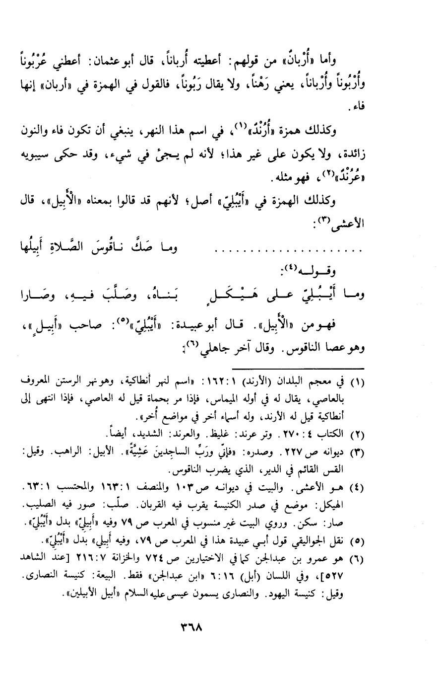 وأما "أُربانٌ" من قولهم: أعطيته أُرباناً، قال أبو عثمان: أعطني عُربوناً وأُربوناً وأرباناً، يعني رهناً، ولا يقال ربوناً، فالقول في الهمزة في "أربان" إنها فاء.