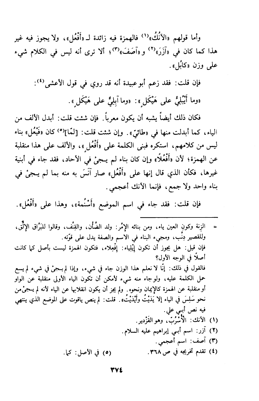 فكان ذلك أيضاً يشبه أن يكون معرباً. فإن شئت قلت: أبدل الألف من الياء، كما أبدلت منها في "طائي". وإن شئت قلت: [لما] كان "فيعل" بناء ليس من كلامهم، استكره فبنى الكلمة على "أفعلٍ"، والألف على هذا منقلبة عن الهمزة؛ لأن "أفعلاً" وإن كان بناء لم يجيء في الآحاد، فقد جاء في أبنية غيرها، فكأن الذي قال إنها على "أفعُل" صار آنس به منه بما لم يجئ في بناء واحد ولا جمع، فإنما الآنك أعجمي.