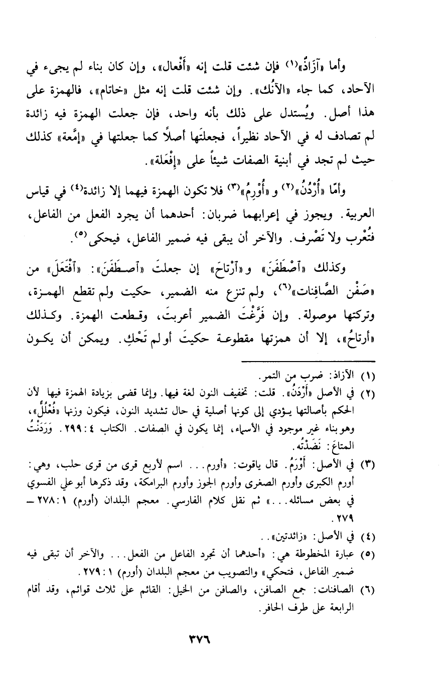 وأما "أُردن" و "أُورم" فلا تكون الهمزة فيهما إلا زائدة في قياس العربية. ويجوز في إعرابهما ضربان: أحدهما أن يجرد الفعل من الفاعل، فتعرب ولا تصرف. والآخر أن يبقى فيه ضمير الفاعل، فيحكي.