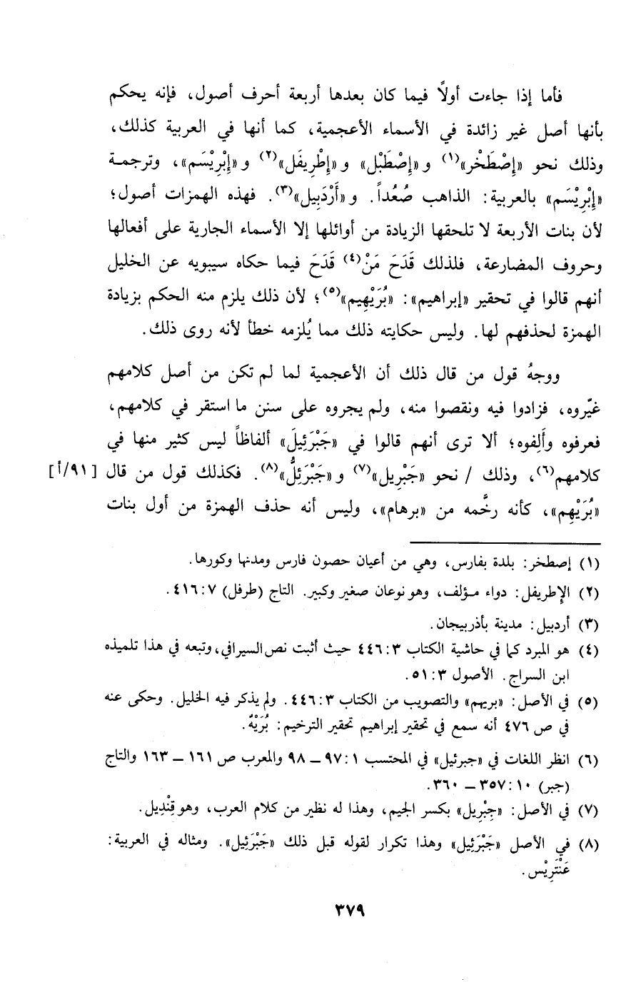 ووجه قول من قال ذلك أن الأعجمية لما لم تكن من أصل كلامهم غيروه، فزادوا فيه ونقصوا منه، ولم يجروه على سنن ما استقر في كلامهم، فعرفوه وألفوه؛ ألا ترى أنهم قالوا في "جبرئيل" ألفاظاً ليس كثير منها كلامهم، وذلك نحو "جبريل" و "جبرئل". فكذلك قول من قال "بُريهم"، كأنه رخمه من "برهام"، وليس أنه حذف الهمزة من أول بنات