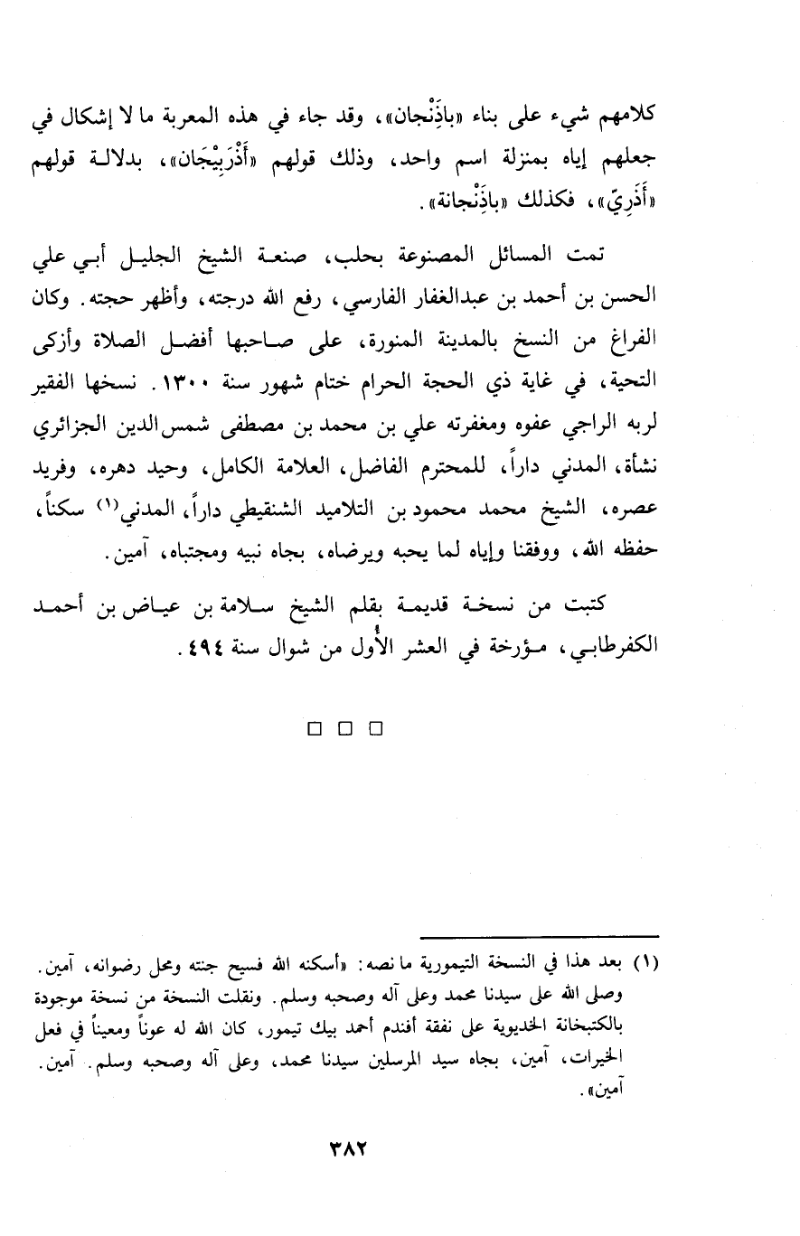 تمت المسائل المصنوعة بحلب، صنعة الشيخ الجليل أبي علي الحسن بن أحمد بن عبد الغفار الفارسي، رفع الله درجته، وأظهر حجته. وكان الفراغ من النسخ بالمدينة المنورة، على صاحبها أفضل الصلاة وأزكى التحية، في غاية ذي الحجة الحرام ختام شهور سنة 1300. نسخها الفقير لربه الراجي عفوه ومغفرته علي بن محمد بن مصطفى شمس الدين الجزائري نشأة، المدني داراً، للمحترم الفاضل، العلامة الكامل، وحيد دهره، وفريد عصره، الشيخ محمد محمود بن التلاميذ الشنقيطي داراً، المدني سكناً، حفظه الله، ووفقنا وإياه لما يحبه ويرضاه، بجاه نبيه ومجتباه، آمين.