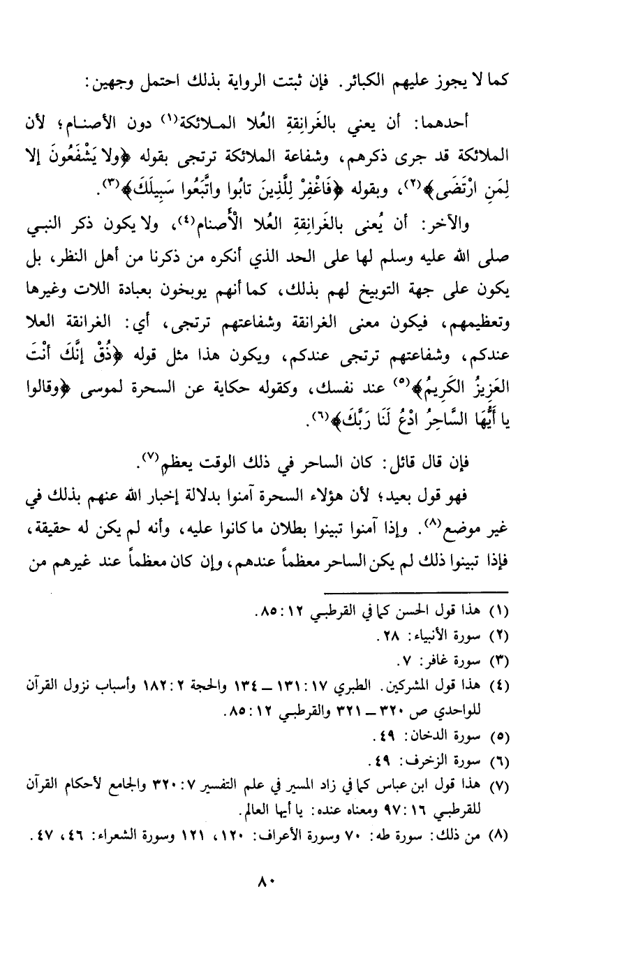 أحدهما: أن يعني بالغرانقة العلا الملائكة دون الأصنام؛ لأن الملائكة قد جرى ذكرهم، وشفاعة الملائكة ترتجى بقوله {ولا يشفعون إلا لمن ارتضى}، وبقوله {فاغفر للذين تابوا اتبعوا سبيلك}.