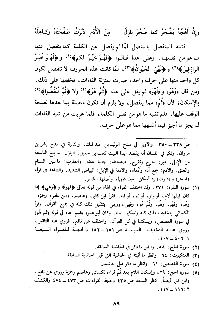 فشبه المنفصل بالمتصل لما لم يفصل عن الكلمة كما ينفصل عنها ما هو من نفسها. وعلى هذا قالوا {فهو خير لكم} و {لهو خير الرازقين} و {لَهْيَ الحيوان}، لما كانت هذه الحروف لا تنفصل لكون كل واحد منها على حرف واحد، صارت بمنزلة الفاءات، فخففها على ذلك. ومن قال "وهو" و"لهو" لم يقل على هذا {ثم هو} ولا {ثم ليقضلوا} بالإسكان؛ لأن "ثم" مما ينفصل، ولا يلزم أن تكون متصلة بما بعدها لصحة الوقف عليها، فلم تشبه ما هو من نفس الكلمة، فلما عربت من شبه الفاءات لم يجز ما أجيز فيما أشبهها مما هو على حرف.