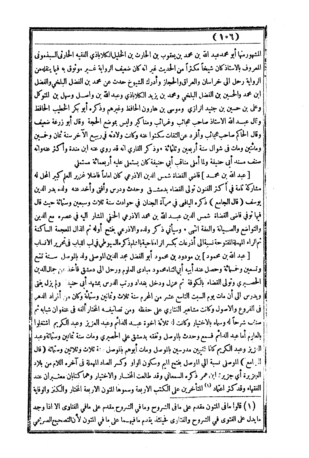 [عبد الله بن محمود] بن مودود بن محمود أبو الفضل مجد الدين الموصلى ولد بالموصل سنة تسع وتسعين وخمسمائة وحصل عند أبيه أبي الثناء محمود مبادى العلوم ورحل إلى دمشق فأخذ عن جمال الدين الحصيري وتولى القضاء بالكوفة ثم عزل ودخل بغداد ورتب الدرس بمشهد أبي حنيفة ولم يزل يفتى ويدرس إلى أن مات يوم السبت التاسع عشر من المحرم سنة ثلاث وثمانين وستمائة وكان من أفراد الدهر في الفروع والأصول وكانت مشاهير الفتاوي على حفظه ومن تصانيفه المختار ألفه في عنفوان شبابه ثم صنف شرحاً له وسماه بالاختيار وكانت له ثلاثة إخوة عبد الدائم وعبد العزيز وعبد الكريم اشتغلوا بالعلوم أما عبد الدائم فسمع وحدث بالموصل وتفقه بدمشق علي الحصيري ومات سنة ثمانين وستمائة وعبد العزيز وعبد الكريم كانا فقيهين مدرسين بالموصل ومات أبوهم بالموصل سنة ثلاث وثلاثين وستمائة.