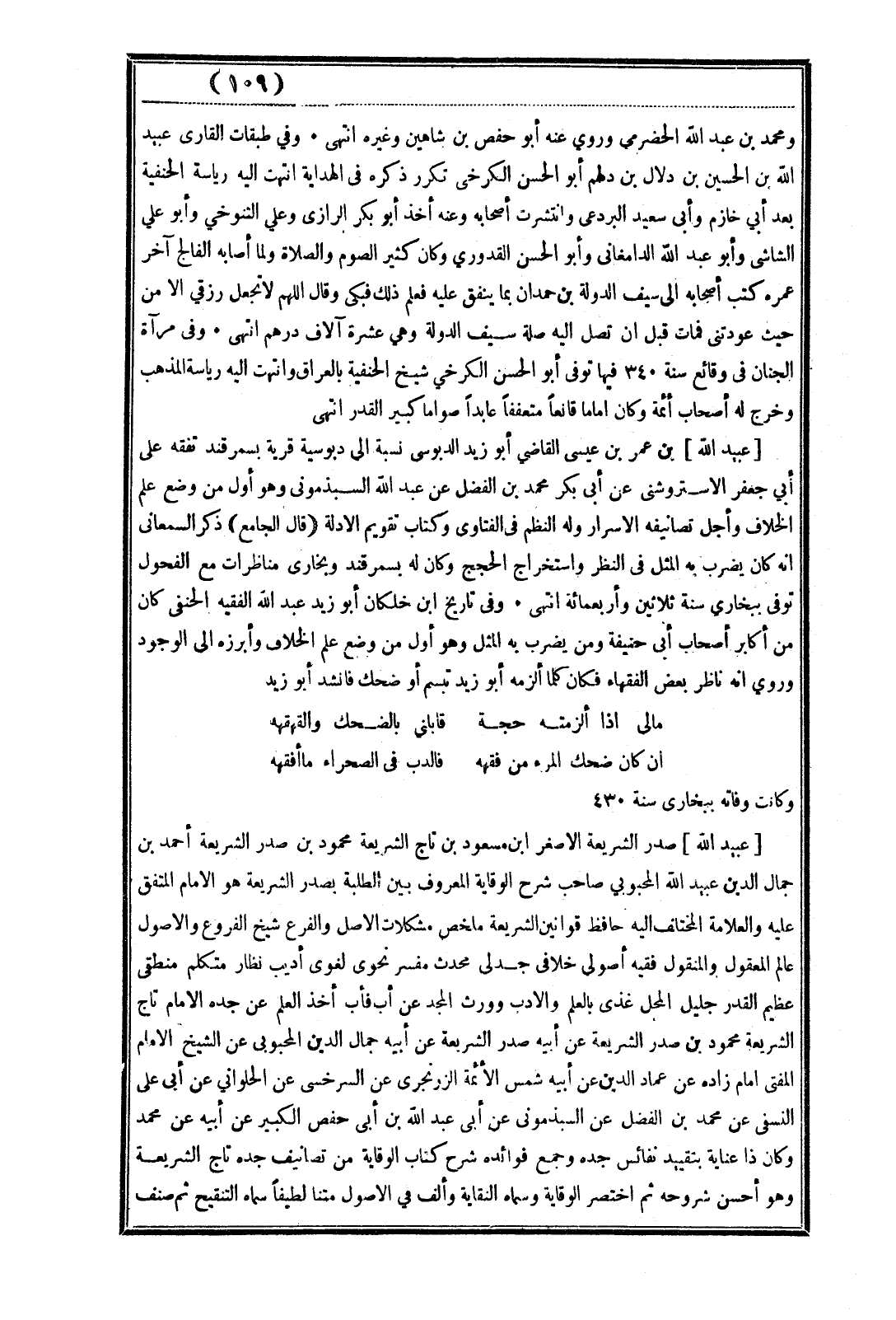 [عبيد الله] صدر الشريعة الأصغر ابن مسعود بن تاج الشريعة محمود بن صدر الشريعة أحمد بن جمال الدين عبد الله المحبوبي صاحب شرح الوقاية المعروف بين الطلبة بصدر الشريعة هو الإمام المتفق عليه والعلامة المختلف إليه حافظ قوانين الشريعة ملخص مشكلات الأصل والفرع شيخ الفروع والأصول عالم المعقول والمنقول فقيه أصولى خلافي جدلى محدث مفسر نحوى لغوى أديب نظار متكلم منطقى عظيم القدر جليل المحل غذى بالعلم والأدب وورث المجد عن أب فأب أخذ العلم عن جده الإمام تاج الشريعة محمود بن صدر الشريعة عن أبيه صدر الشريعة عن أبيه جمال الدين المحبوبى عن الشيخ الإمام المفتى إمام زاده عن عماد الدين عن أبيه شمس الأئمة الزرنجري عن السرخسى عن الحلواني عن أبي على النسفي عن محمد بن الفضل عن السبذمونى عن أبى عبد الله بن أبى حفص الكبير عن أبيه عن محمد وكان ذا عناية بتقييد نفائس جده وجمع فوائده شرح كتاب الوقاية من تصانيف جده تاج الشريعة وهو أحسن شروحه ثم اختصر الوقاية وسماه النقاية وألف في الأصول متنا لطيفاً سماه التنقيح ثم صنف