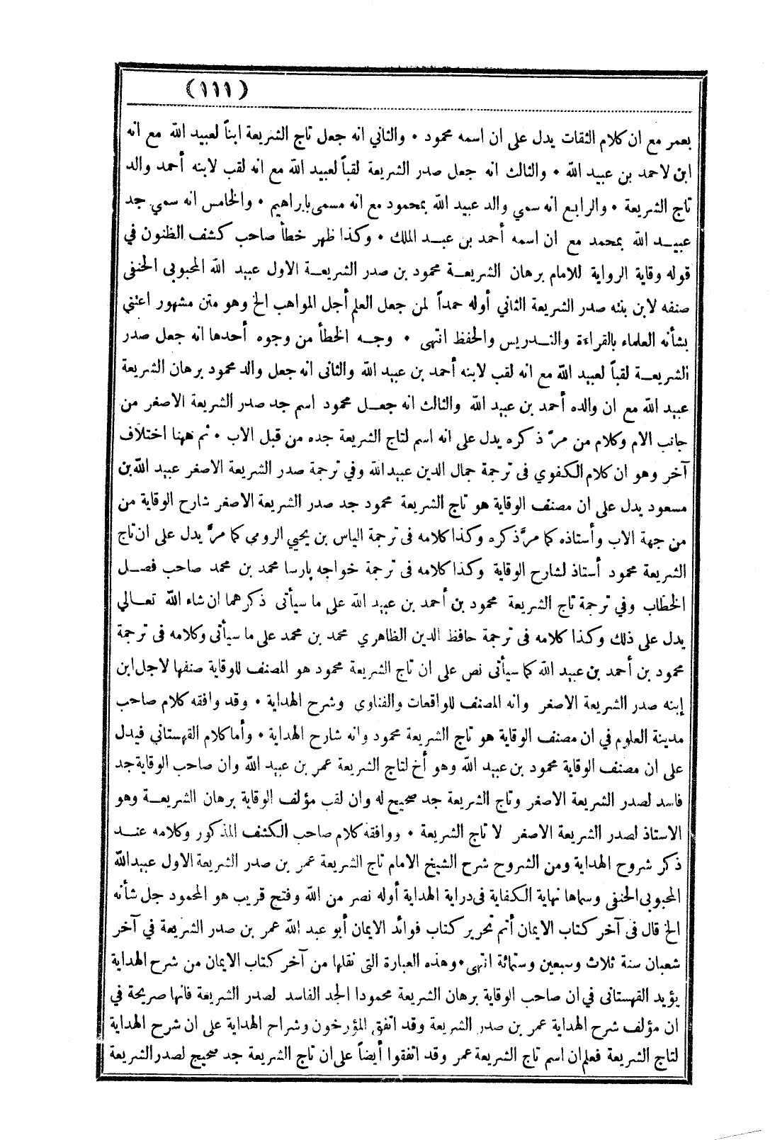 بعمر مع أن كلام الثقات يدل على أن اسمه محمود. والثاني أنه جعل تاج الشريعة ابنًا لعبيد الله مع أنه ابن لأحمد بن عبيد الله. والثالث أنه جعل صدر الشريعة لقبًا لعبيد الله مع أنه لقب لابنه أحمد والد تاج الشريعة. والرابع أنه سمي والد عبيد الله بمحمود مع أنه مسمي بإبراهيم. والخامس أنه سمي جد عبيد الله بمحمد مع أن اسمه أحمد بن عبد الملاك. وكذا ظهر خطأ صاحب كشف الظنون في قوله وقاية الرواية الإمام برهان الشريعة محمود بن صدر الشريعة الأول عبد الله المحبوبي الحنفي صنفه لابن بنته صدر الشريعة الثاني أوله حمدًا لمن جعل العلم أجل المواهب الخ وهو متن مشهور اعتني بشأنه العلماء بالقراءة والتدريس والحفظ انتهى. وجه الخطأ من وجوه أحدها أنه جعل صدر الشريعة لقبًا لعبيد الله مع أنه لقب لابنه أحمد بن عبد الله والثانى أنه جعل والد محمود برهان الشريعة عبد الله مع أن والده أحمد بن عبد الله والثالث أنه جعل محمود اسم جد صدر الشريعة الأصغر من جانب الأم وكلام من مرّ ذكره يدل على أنه اسم لتاج الشريعة جده من قبل الاب. ثم هاهنا اختلاف آخر وهو أن كلام الكفوي في ترجمة جمال الدين عبد الله وفي ترجمة صدر الشريعة الأصغر عبد الله بن مسعود يدل على أن مصنف الوقاية هو تاج الشريعة محمود جد صدر الشريعة الأصغر شارح الوقاية من من جهة الأب وأستاذه كما مرَّ ذكره وكذا كلامه في ترجمة إلياس بن يحيى الرومي كما مرَّ يدل علي أن تاج الشريعة محمود أستاذ لشارح الوقاية وكذا لكلامه في ترجمة خواجه بارسا محمد بن محمد صاحب فصل الخطاب وفي ترجمة تاج الشريعة محمود بن أحمد بن عبد الله على ما سيأتى ذكرهما إن شاء الله تعالى يدل على ذلك وكذا كلامه في ترجمة حافظ الدين الظاهري محمد بن محمد على ما سيأتى وكلامه في ترجمة محمود بن أحمد بن عبد الله كما سيأتى نص على أن تاج الشريعة محمود هو المصنف للوقاية صنفها لأجل ابن إبنه صدر الشريعة الأصغر وأنه المصنف للواقعات والفتاوى وشرح الهداية. وقد وافقه كلام صاحب مدينة العلوم في أن مصنف الوقاية هو تاج الشريعة محمود وأنه شارح الهداية. وأما كلام القهستاني فيدل على أن مصنف الوقاية محمود بن عبد الله وهو أخ لتاج الشريعة عمر بن عبد الله وإن صاحب الوقاية جد فاسد لصدر الشريعة الأصغر وتاج الشريعة جد صحيح له وأن لقب مؤلف الوقاية برهان الشريعة وهو الأستاذ لصدر الشريعة الأصغر لا تاج الشريعة. ووافقة كلام صاحب الكشف المذكور وكلامه عند ذكر شروح الهداية ومن الشروح شرح الشيخ الإمام تاج الشريعة عمر بن صدر الشريعة الأول عبد الله المحبوبي الحنفي وسماها نهاية الكفاية في دراية الهداية أوله نصر من الله وفتح قريب هو المحمود جل شأنه الخ قال في آخر كتاب الإيمان أتم تحرير كتاب فوائد الإيمان أبو عبد الله عمر بن صدر الشريعة في آخر شعبان سنة ثلاث وسبعين وستمائة انتهى. وهذه العبارة التى نقلها من آخر كتاب الإيمان من شرح الهداية يؤيد القهستانى في أن صاحب الوقاية برهان الشريعة محمودا الجد الفاسد لصدر الشريعة فإنها صريحة في أن مؤلف شرح الهداية عمر بن صدر الشريعة وقد اتفق المؤرخون وشراح الهداية على أن شرح الهداية لتاج الشريعة فعلم أن اسم تاج الشريعة عمر وقد اتفقوا أيضًا على أن تاج الشريعة جد صحيح لصدر الشريعة
