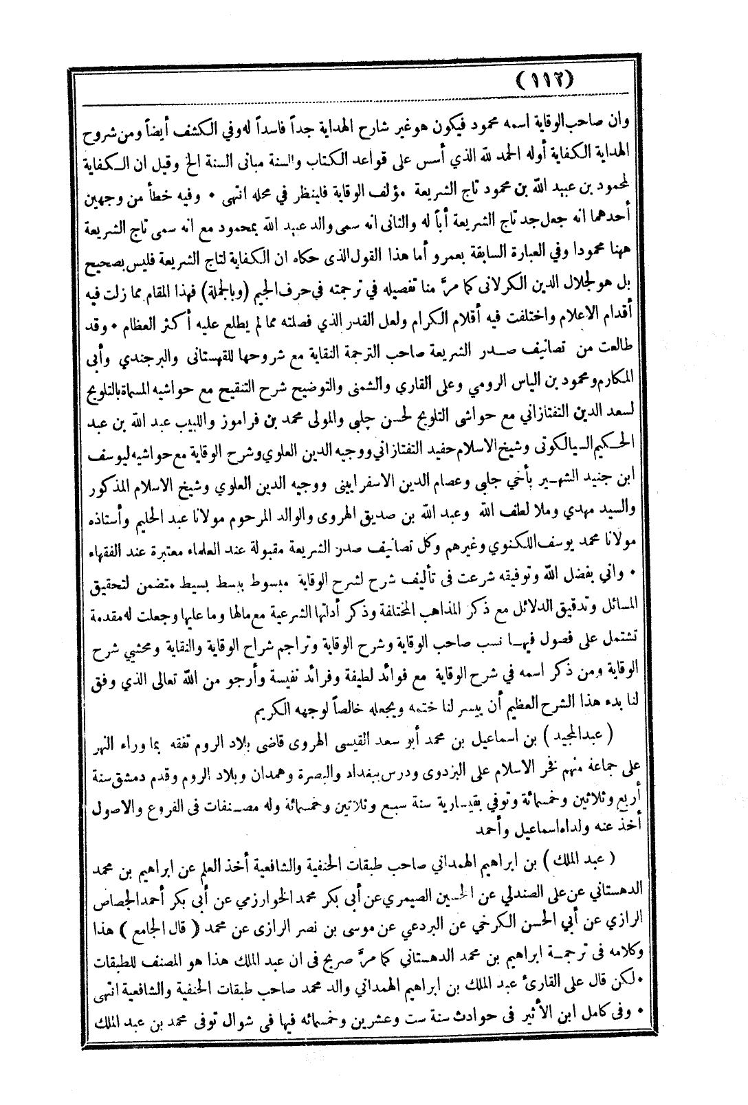 وأن صاحب الوقاية اسمه محمود فيكون هو غير شارح الهداية جدًا فاسدًا له وفي الكشف أيضًا ومن شروح الهداية الكفاية أوله الحمد لله الذي أس على قواعد الكتاب والسنة مبانى السنة الخ وقبل أن الكفاية لمحمود بن عبد الله بن محمود تاج الشريعة مؤلف الوقاية فلينظر في محله انتهى. وفيه خطأ من وجهين أحدهما أنه جعل جد تاج الشريعة أبًا له والثانى أنه سمى والد عبد الله بمحمود مع أنه سمى تاج الشريعة هاهنا محمودا وفي العبارة السابقة بعمرو أما هذا القول الذى حكاه أن الكفاية لتاج الشريعة فليس بصحيح بل هو لجلال الدين الكرلانى كما مرَّ منا تفصيله في ترجمته في حرف الجيم.