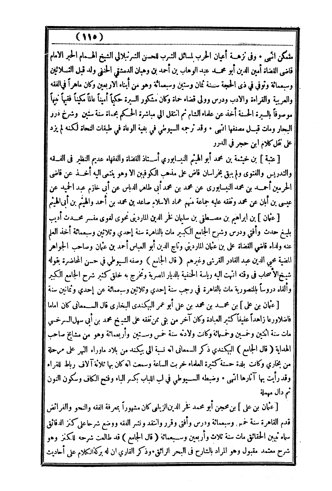 [عثمان بن علي] بن محجن أبو محمد فخر الدين الزيلعى كان مشهورًا معرفة الفقه والنحو والفرائض قدم القاهرة سنة خمس، وسبعمائة ودرس وأفتى وقرر وانتقد ونشر الفقه ووضع شرحا على كنز الدقائق سماء تبين الحقائق مات سنة ثلاث وأربعين وسبعمائة.