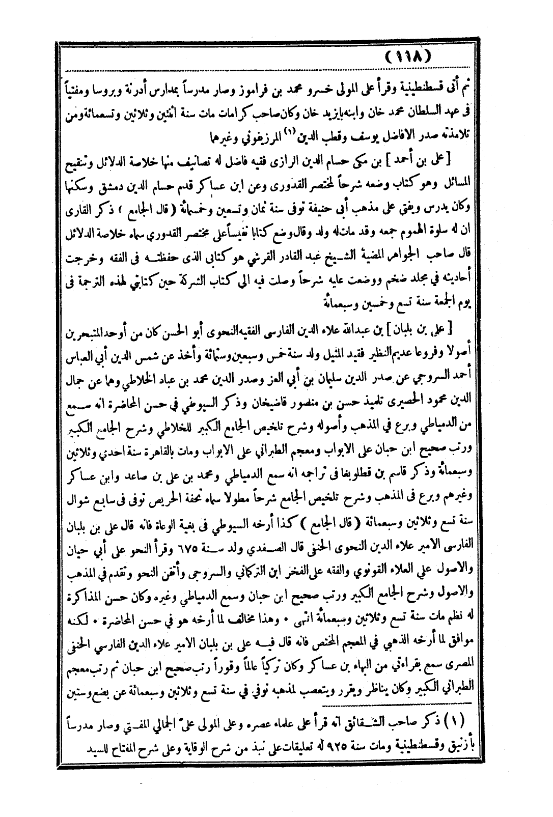 (¬1) ذكر صاحب الشقائق أنه قرأ على علماء عصره وعلى المولى عليّ الجمالي المفتي وصار مدرسًا بأزنيق وقسطنطينية ومات سنة 935 له تعليقات على نبذ من شرح الوقاية وعلى شرح المفتاح للسيد =