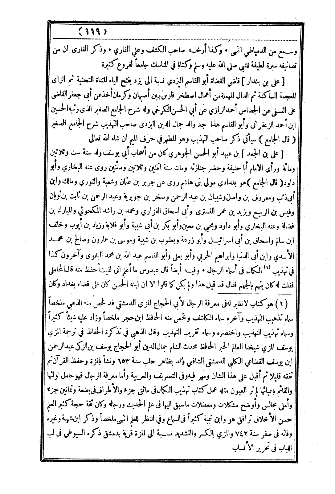 (¬1) هو كتاب لا نظير له في معرفة الرجال لأبي الحجاج المزي الدمشقي قد لخص منه الذهبي ملخصًا سماه تذهيب التهذيب وآخره سماه الكاشف ولخص منه الحافظ ابن حجر ملخصًا وزاد عليه شيئًا كثيرًا وسماه تهذيب التهذيب واختصره وسماه تقريب التهذيب وقال الذهبي في تذكرة الحفاظ في ترجمة المزي يوسف المزي شيخنا العالم الحبر الحافظ محدث الشام جمال الدين أبو الحجاج يوسف بن الزكي عبد الرحمن ابن يوسف القضاعي الكلبي الدمشقي الشافعي وُلد بظاهر حلب سنة 635 ونشأ بالمزة وحفظ القرآن ثم تفقه قليلا ثم أقبل على هذا الشأن ومهر فيه وفي التصريف والعربية وأما معرفة الرجال فهو حامل لوائها والقائم بأعبائها لم تر العيون مثله عمل كتاب تهذيب الكمال في مائتى جزء والأطراف في بضعة وثمانين جزء أملى مجالس وأوضح مشكلات ومعضلات ما سبق إليها في علم الحديث ورجاله وكان ثقة حجة كثير العلم حسن الأخلاق ترافق هو وابن تيمية كثيرًا في السماع وفي النظر للعلم انتهى ملخصًا وذكر ابن شهبة وغيره وفاته في صفر سنة 742 والمزي بالكسر والتشديد نسبة إلى المزة قرية بدمشق ذكره السيوطي في لب اللباب في تحرير الأنساب.