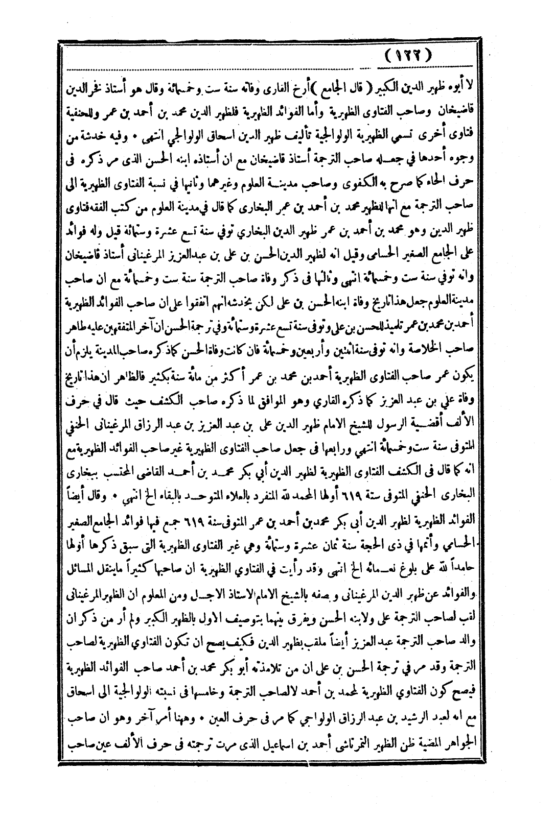 لا أبوه ظهير الدين الكبير. (قال الجامع) أرخ الفنارى وفاته سنة ست وخمسمائة وقال هو أستاذ فخر الدين قاضيخان وصاحب الفتاوى الظهيرية وأما الفوائد الظهيرية فلظهير الدين محمد بن أحمد بن عمر وللحنفية فتاوى أخرى تسمى الظهيرية الولولجة تأليف ظهير السين إسحاق الواوالجي انتهى. وفيه خدشة من وجوه أحدها في جعله صاحب الترجمة أستاذ قاضيخان مع أن أستاذه ابنه الحسن الذى مر ذكره في حرف الحاء كما صرح به الكفوى وصاحب مدينة العلوم وغيرهما وثانيها في نسبة الفتاوى الظهيرية إلى صاحب الترجمة مع أنها للظهير محمد بن أحمد بن عمر البخارى كما قال في مدينة العلوم من كتب الفقه فتاوى ظهير الدين وهو محمد بن أحمد بن عمر ظهير الدين البخاري توفي سنة تسع عشرة وستمائة قبل وله فوائد على الجامع الصغير الحسامي وقيل إنه لظهير الدين الحسن بن علي بن عبد العزيز المرغينانى أستاذ قاضيخان وأنه توفي سنة ست وخمسمائة انتهى وثالثها في ذكر وفاة صاحب الترجمة سنة ست وخمسمائة مع أن صاحب مدينة العلوم جعل هذا تاريخ وفاة ابنه الحسن بن علي لكن يحدث أنهم اتفقوا على أن صاحب الفوائد الظهيرية أحمد بن محمد بن عمر تلميذ للحسن بن علي وتوفي سنة تسع عشرة وستمائة وفي ترجمة الحسن أن آخر المتفقهين عليه طاهر صاحب الخلاصة وأنه توفي سنة اثنين وأربعين وخمسمائة فإن كانت وفاة الحسن كما ذكره صاحب المدينة يلزم أن يكون عمر صاحب الفتاوى الظهيرية أحمد بن محمد بن عمر أكثر من مائة سنة بكثير فالظاهر أن هذا تاريخ وفاة علي بن عبد العزيز كما ذكره القاري وهو الموافق لما ذكره صاحب الكشف حيث قال في حرف الألف أقضية الرسول للشيخ الإمام ظهير الدين علي بن عبد العزيز بن عبد الرزاق المرغيناني الحنفي المتوفى سنة ست وخمسمائة انتهى ورابعها في جعل صاحب الفتاوى الظهيرية غير صاحب الفوائد الظهيرية مع أنه كما قال في الكشف الفتاوى الظهيرية لظهير الدين أبي بكر محمد بن أحمد القاضى المحتسب ببخارى البخارى الحنفي المتوفى سنة 619 أولها المحمد لله المنفرد بالعلاء المتوحد بالبقاء الخ انتهى. وقال أيضًا الفوائد الظهيرية لظهير الدين أبي بكر محمد بن أحمد بن عمر المتوفى سنة 619 جمع فيها فوائد الجامع الصغير الحسامي وأتمها في ذى الحجة سنة ثمان عشرة وستمائة وهي غير الفتاوى الظهيرية التى سبق ذكرها أولها حامدًا لله على بلوغ نعمائه الخ انتهى وقد رأيت في الفتاوي الظهيرية أن صاحبها كثيرًا ما ينقل المسائل والفوائد عن ظهير الدين المرغيناني وبصفه بالشيخ الإمام الأستاذ الأجل ومن العلوم أن الظهير المرغيناني لقب لصاحب الترجمة على ولابنه الحسن ويفرق بينهما بتوصيف الأول بالظهير الكبير ولم أر من ذكر أن والد صاحب الترجمة عبد العزيز أيضًا ملقب بظهير الدين فكيف يصح أن تكون الفتاوي الظهيرية لصاحب الترجمة وقد مر في ترجمة الحسن بن علي أن من تلامذته أبو بكر محمد بن أحمد صاحب الفوائد الظهيرية فيصح كون الفتاوي الظهيرية لمحمد بن أحمد لا لصاحب الترجمة وخامسها في نسبته الولوالجية إلى إسحاق مع أنه لعبد الرشيد بن عبد الرزاق الولواجي كما مر في حرف العين. وهاهنا أمر آخر وهو أن صاحب الجواهر المضية ظن الظهير التمرتاشى أحمد بن إسماعيل الذى مرت ترجمته في حرف الألف عين صاحب