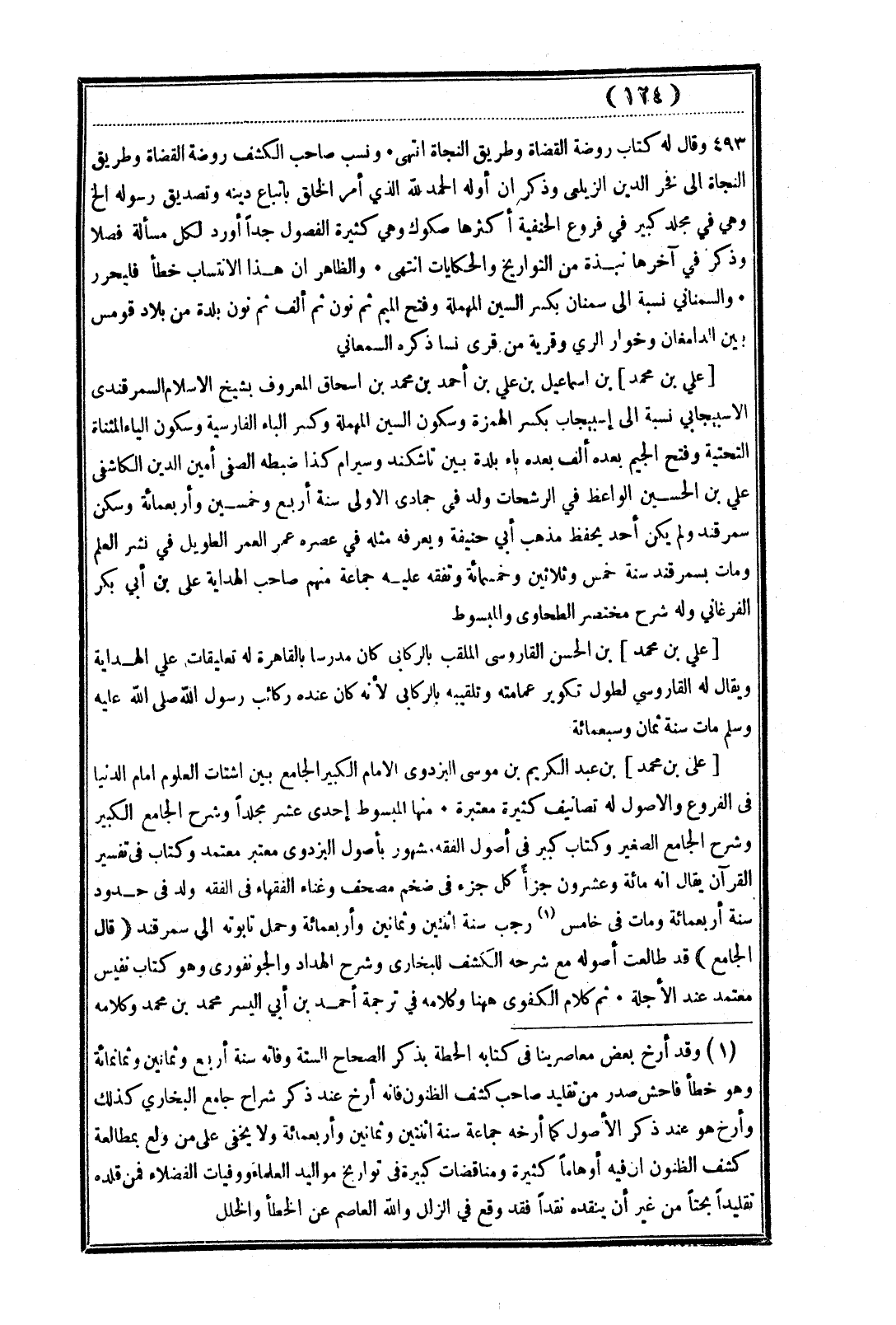 (¬1) وقد أرخ بعض معاصرينا في كتابه الحطة بذكر الصحاح الستة وفاته سنة أربع وثمانين وثمانمائة وهو خطأ فاحش صدر من تقليد صاحب كشف الظنون فإنه أرخ عند ذكر شراح جامع البخاري كذلك وأرخ هو عند ذكر الأصول كما أرخه جماعة سنة اثنتين وثمانين وأربعمائة ولا يخفى على من ولع بمطالعة كشف الظنون أن فيه أوهامًا كثيرة ومناقضات كبيرة في تواريخ مواليد العلماء ووفيات الفضلاء فمن قلده تقليدًا بحتًا من غير أن ينقده نقدًا فقد وقع في الزلل والله العاصم عن الخطأ والخلل.